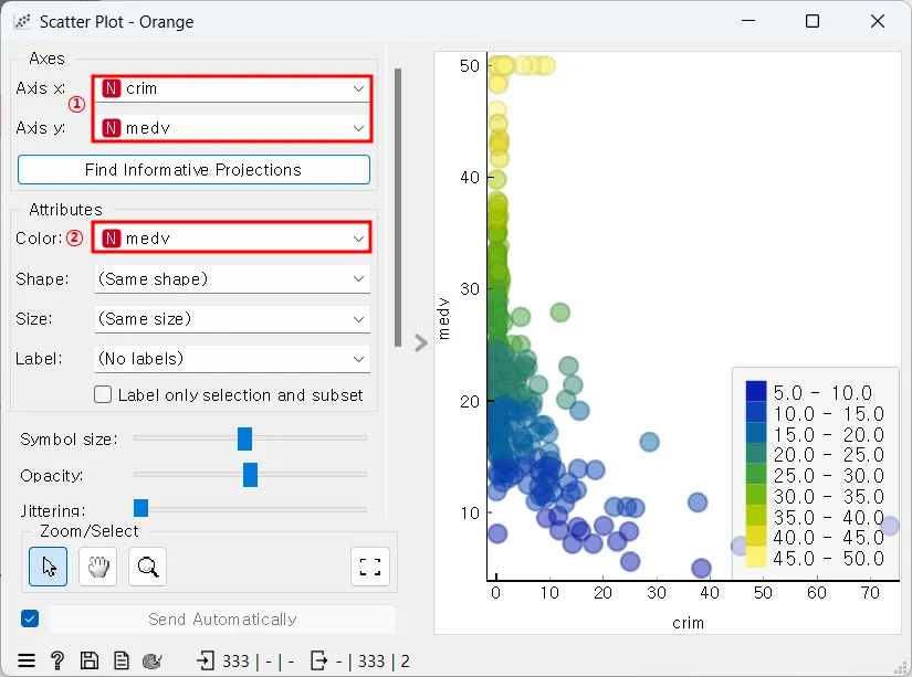 Axes에서 x와 y를 각각 crim, medv로 설정한 후 Attibutes에 Color를 medv로 설정하면, 범죄율(crim)과 주택가격(medv)의 관계를 점 그래프(Scatter Plot)로 확인할 수 있습니다.
