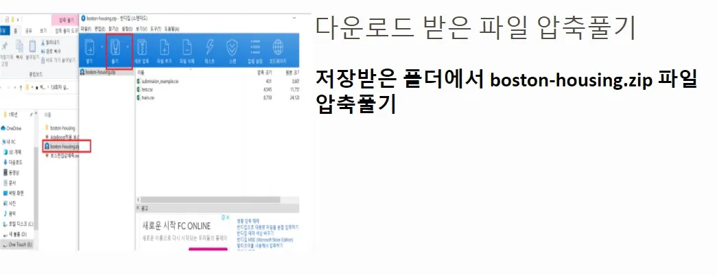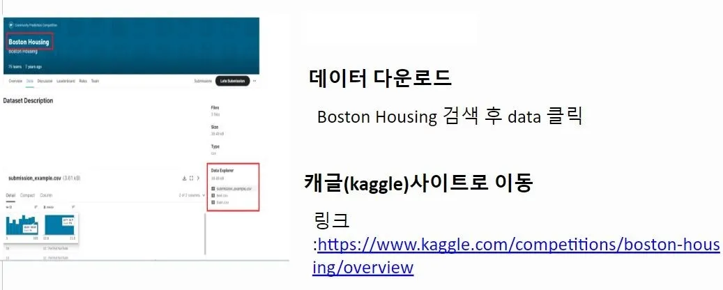 캐글 사이트에서 ‘Boston Housing’을 검색하고 다운로드를 합니다.