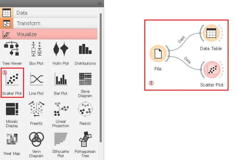 오렌지3에서는 표(정형데이터)로 나타낼 수 있는 Data Table과 표를 시각화한 자료인 점 그래프(Scatter plot)로 나누어 볼 수 있습니다.