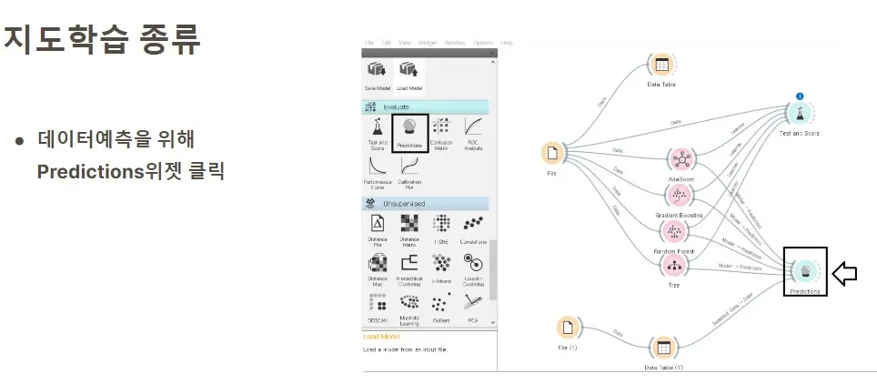 train.csv 파일을 기계학습 모델과 연결한 후에 그 결과를 Predictions 위젯에 연결합니다. test.csv 파일 역시 Predictions 위젯에 연결합니다. 이는 train.csv파일로 기계학습을 마치고 주택 가격(medv) 속성이 없는 test.csv 파일의 주택 가격을 예측하는 것입니다.