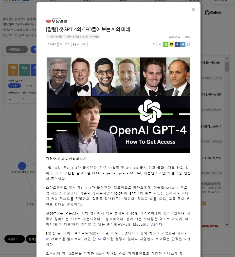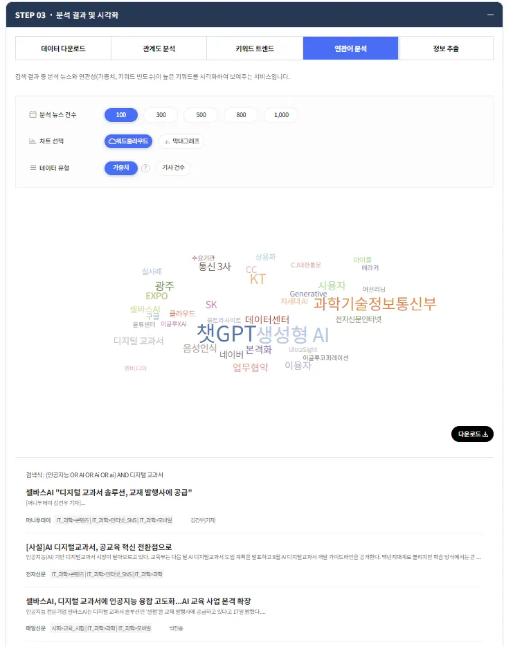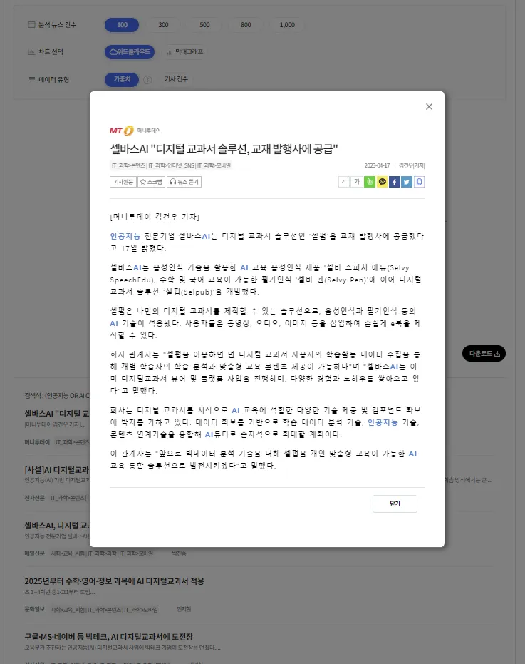 연관어 분석을 통해서는 워드 클라우드로 관련된 키워드를 확인할 수 있고 키워드를 클릭해서 관련된 기사를 함께 볼 수 있습니다.