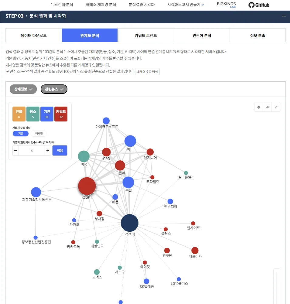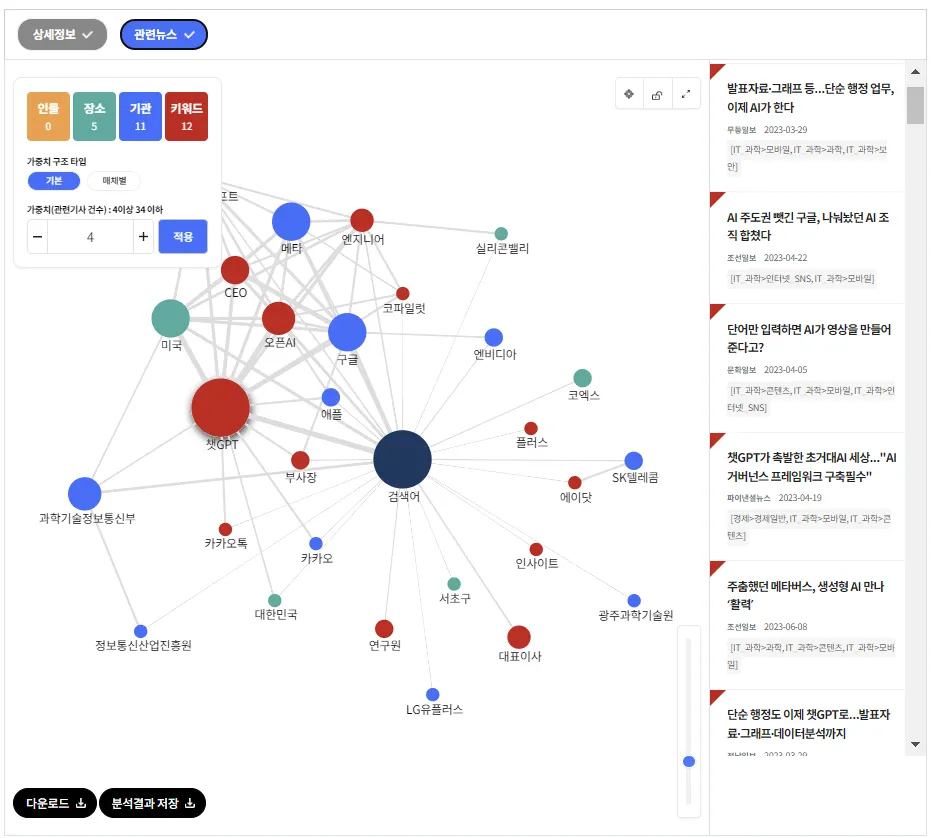 관계도 분석을 통해서 인공지능과 관련된 인물, 장소, 기관, 키워드를 확인할 수 있습니다.