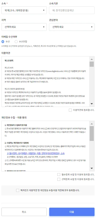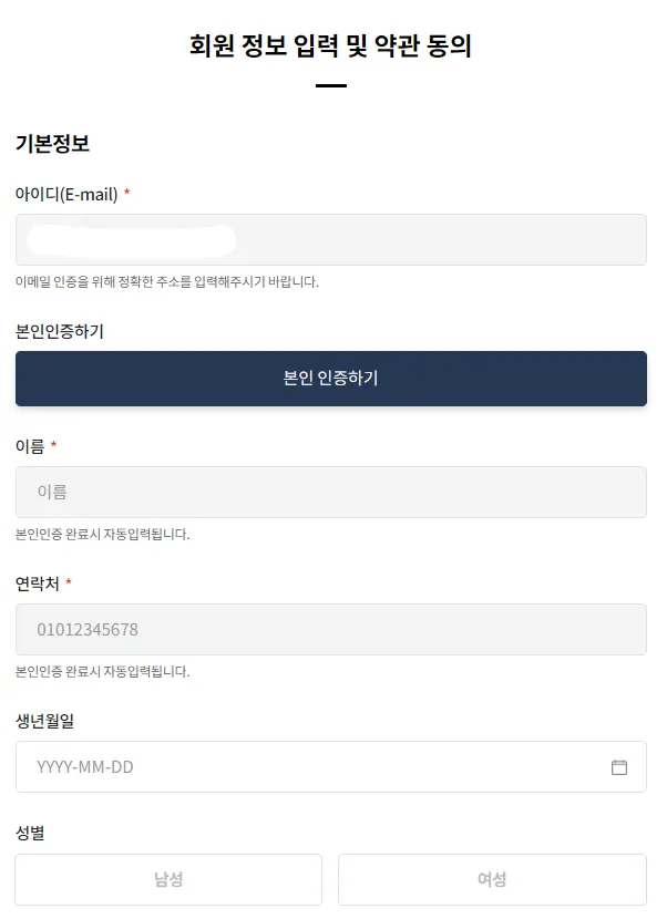 본인 인증과 소속 등을 입력하면 회원가입이 완료됩니다.