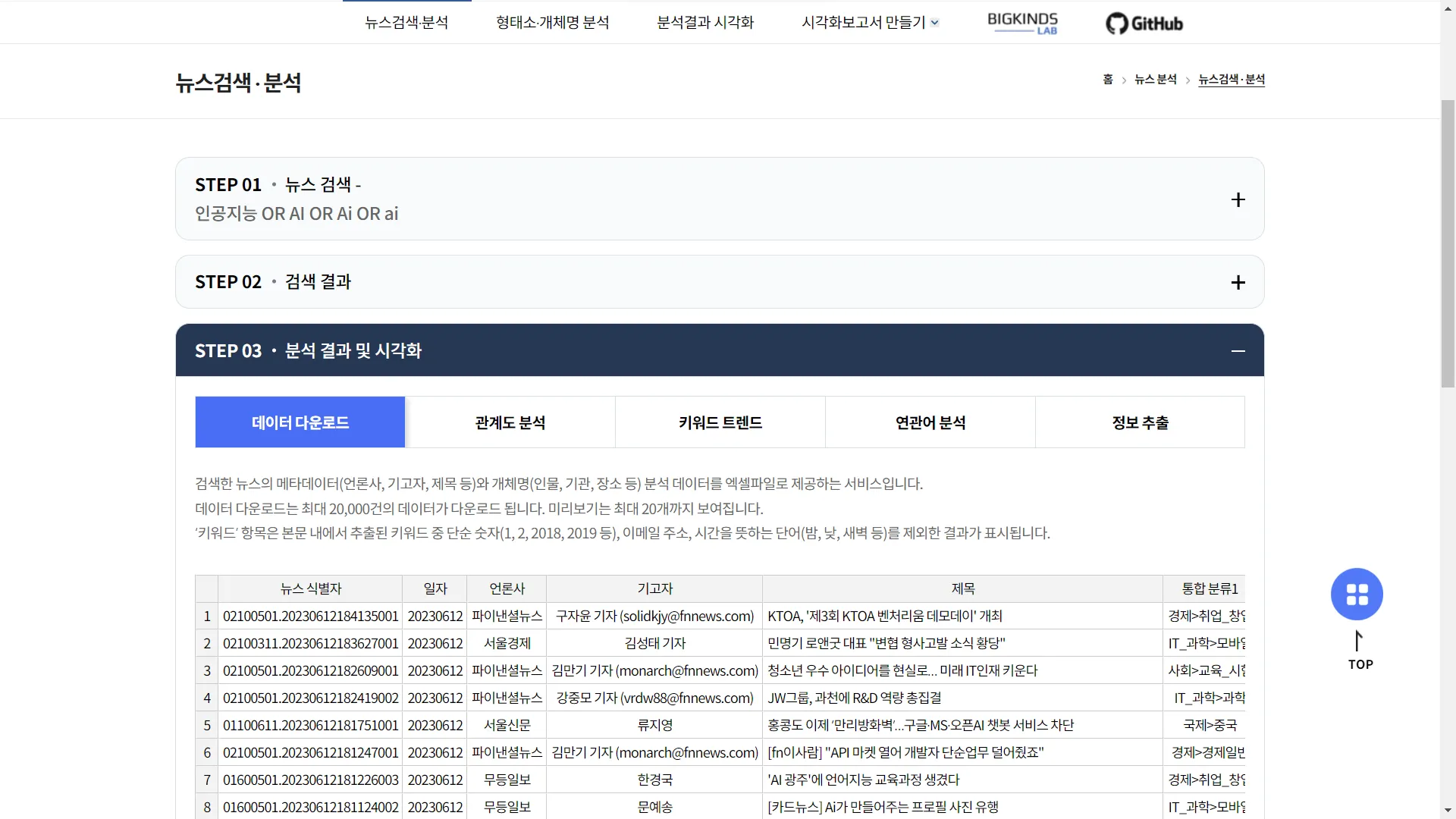 인공지능에 대한 기사들을 빅카인즈를 활용해서 쉽고 재밌게 찾아볼 수 있습니다.