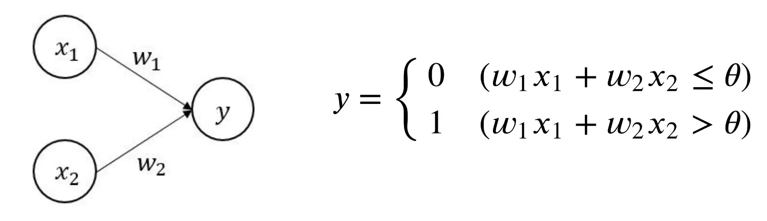 퍼셉트론은 입력값을 받아서 각각의 입력 값에 가중치를 곱해 합한 뒤 그 값이 정해진 한계(임계값, θ)를 넘어설 때만 1을 출력합니다. 이때 1은 ‘신호가 흐른다’라는 뜻이며, 임계값을 넘지 않는 경우에는 0(신호가 흐르지 않는다)을 출력합니다.