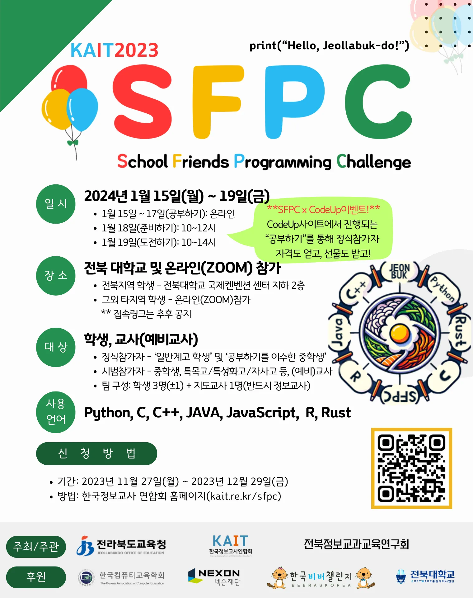 저는 중학교에서 방과 후 수업을 통해 가르친 학생들과 함께 참여 했습니다. 프로그래밍에 관심이 있는 학생들이 진입 장벽 없이 참여할 수 있어서 프로그래밍 대회 참여 경험을 할 좋은 기회라 생각하여 참여하게 됐습니다.
