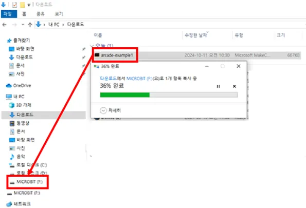 2. 가끔 다운받은 .hex 파일을 마이크로비트 폴더에 넣어도 실행 오류가 나타나기도 합니다. 저의 경우에는 파일을 다시 다운받아 마이크로비트 폴더에 넣는 과정을 반복하다 보면 실행이 됩니다.