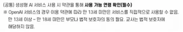 서울특별시교육청의 ‘학교급별 생성형 AI 활용 지침’에서는 생성형 AI 서비스의 사용 가능 연령 확인이 필수 사항임을 밝히고 있습니다.