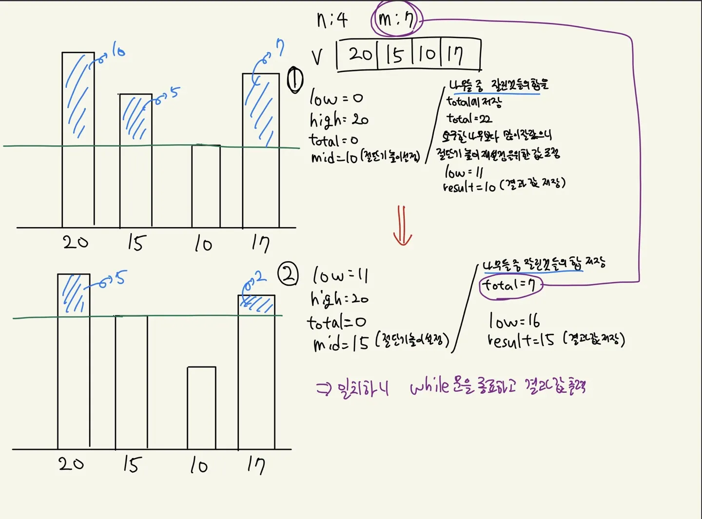 ⇒ 결국, 나무를 자른 후에 합계가 요구 나무 길이(M)과 동일한지 확인을 하는 것이 핵심이다!