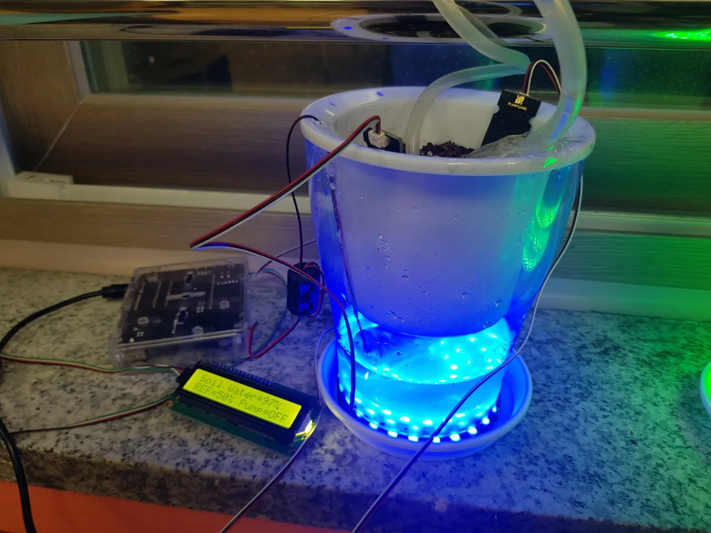 토양에 있는 수분의 양에 따라 자동으로 물을 주고 다양한 색의 LED를 켜주는 화분