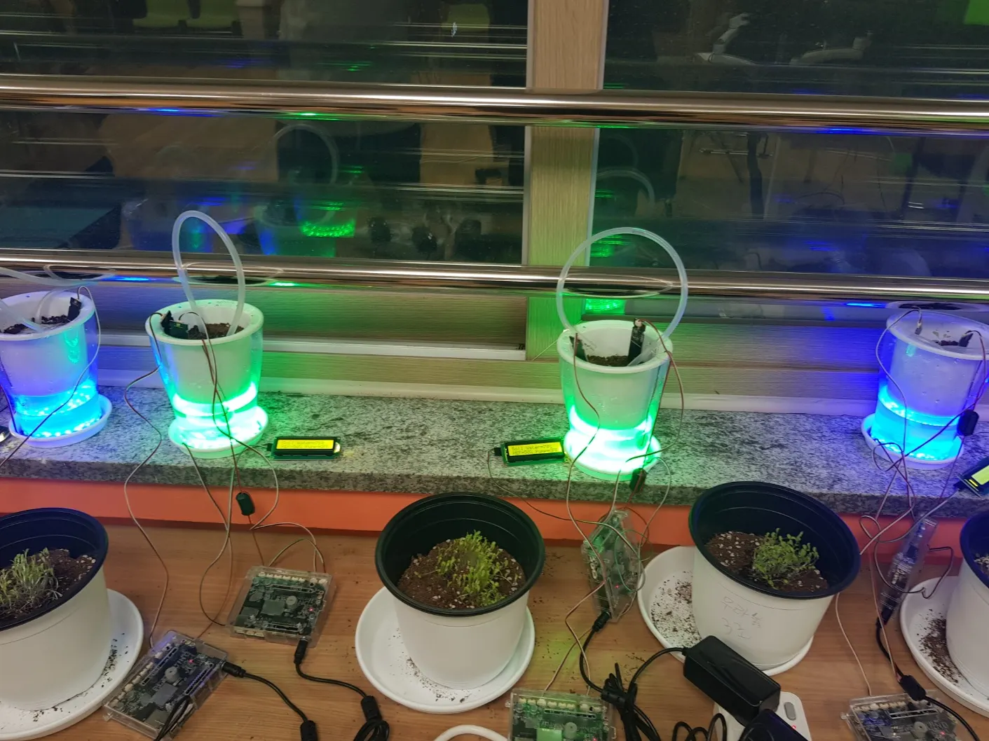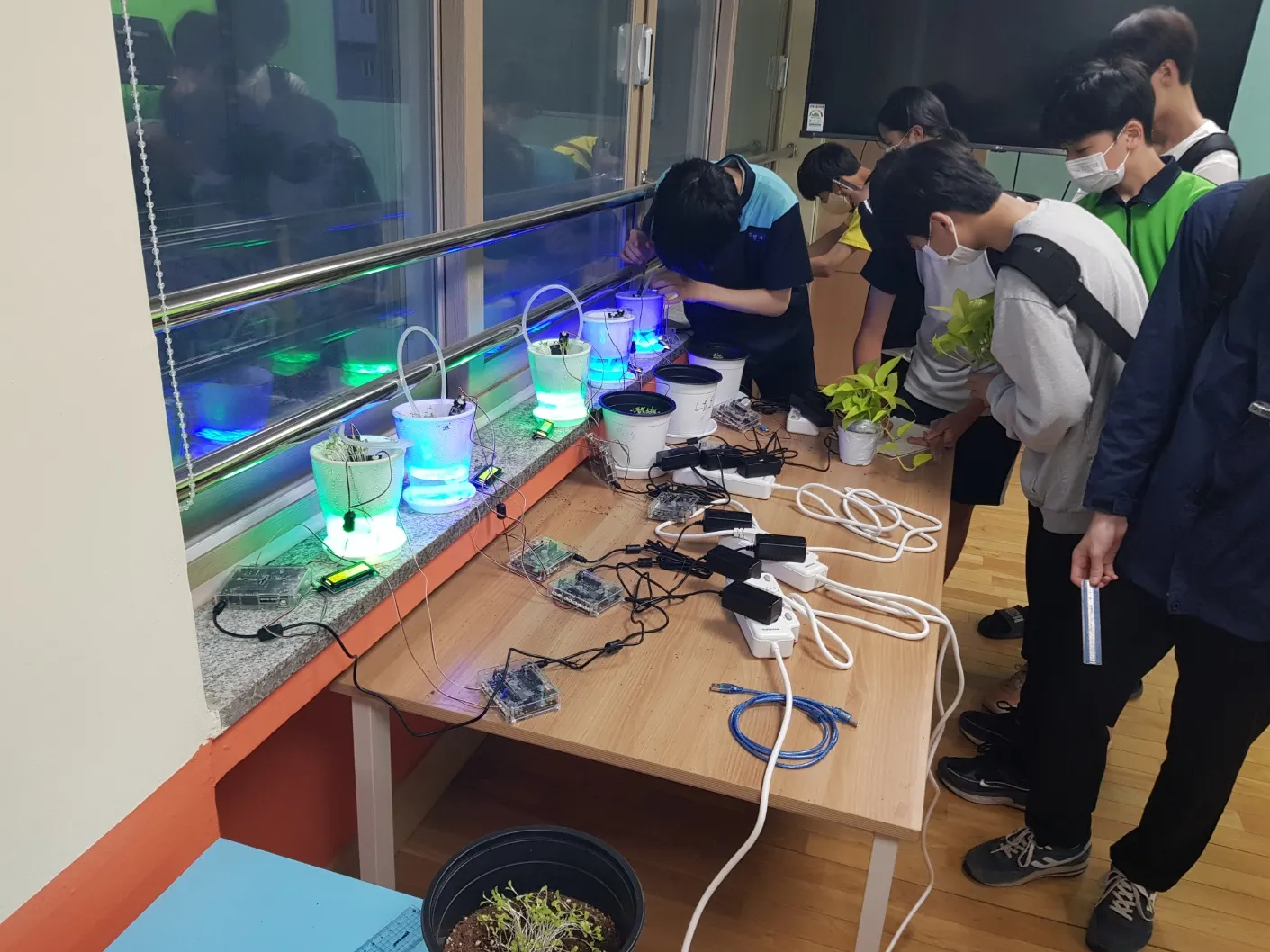<2,3 차시에서 제작한 자동으로 물을 주는 화분과 토양 수분에 따라 달라지는 LED 화분을 설치하는 모습>