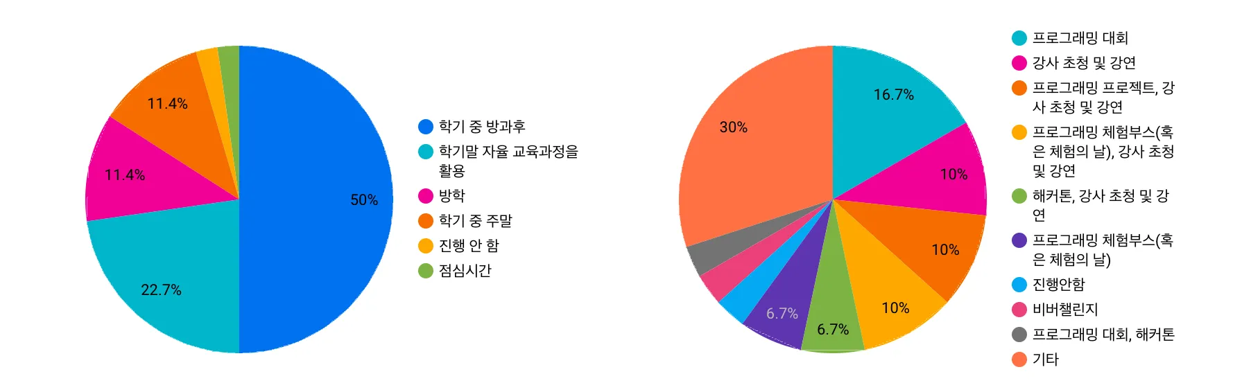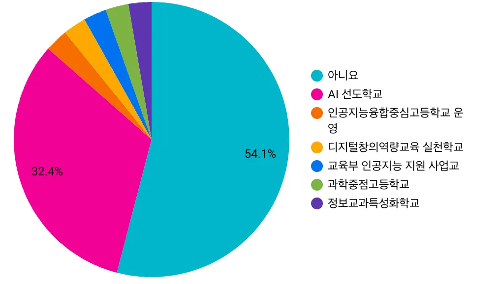 보시다시피 행사를 진행하는 학교의 경우 64% 정도가 목적 사업비에서 사용되고 있는 것을 확인할 수 있었습니다. 그리고 예상외로 학교 자체 예산으로 진행하는 경우도 약 30%로 적지 않은 것을 알 수 있었습니다. 아무래도 선생님들이 선도학교를 신청하시는 많은 이유가 예산 확보의 목적이 큰 비중을 차지하기 때문이겠죠? 프레첼은 이번 설문으로 전국에서 정말 다양한 선도학교를 운영하고 있음을 알 수 있었는데요! 인공지능 선도학교부터 시작해서 인공지능융합중심고등학교, 디지털창의역량 교육 실천학교, 인공지능 지원 사업교, 과학중점고 등등 이름은 다르지만, 많은 선생님들이 좋은 교육을 위해 노력하신다니! 정말 대단하십니다. 짝짝짝!