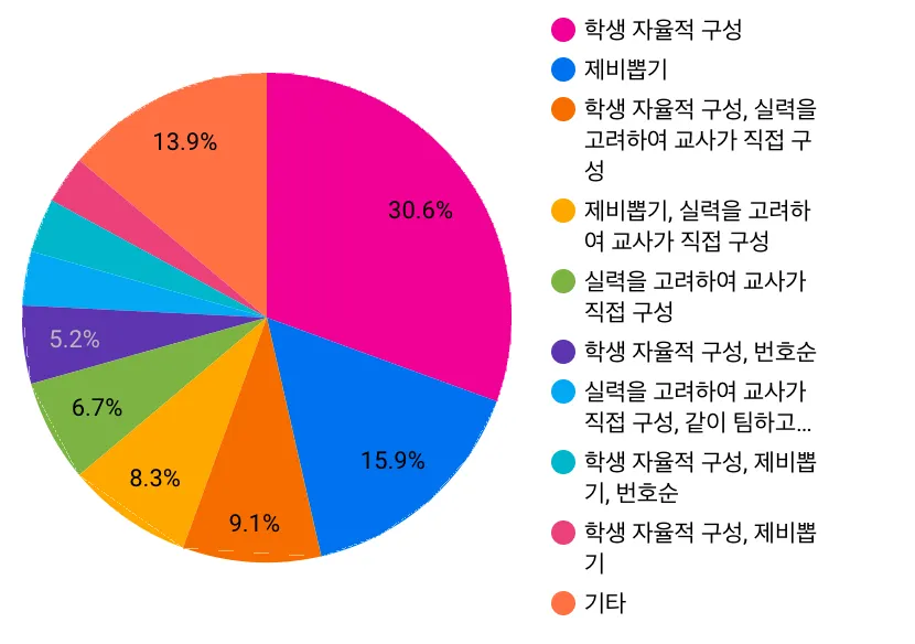 아무래도 장단점이 극명한 방식이기 때문에 수업에 따라 제비뽑기와 자율 구성을 선택하시는 것 같습니다.