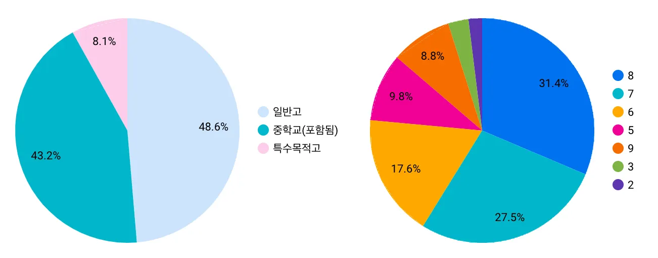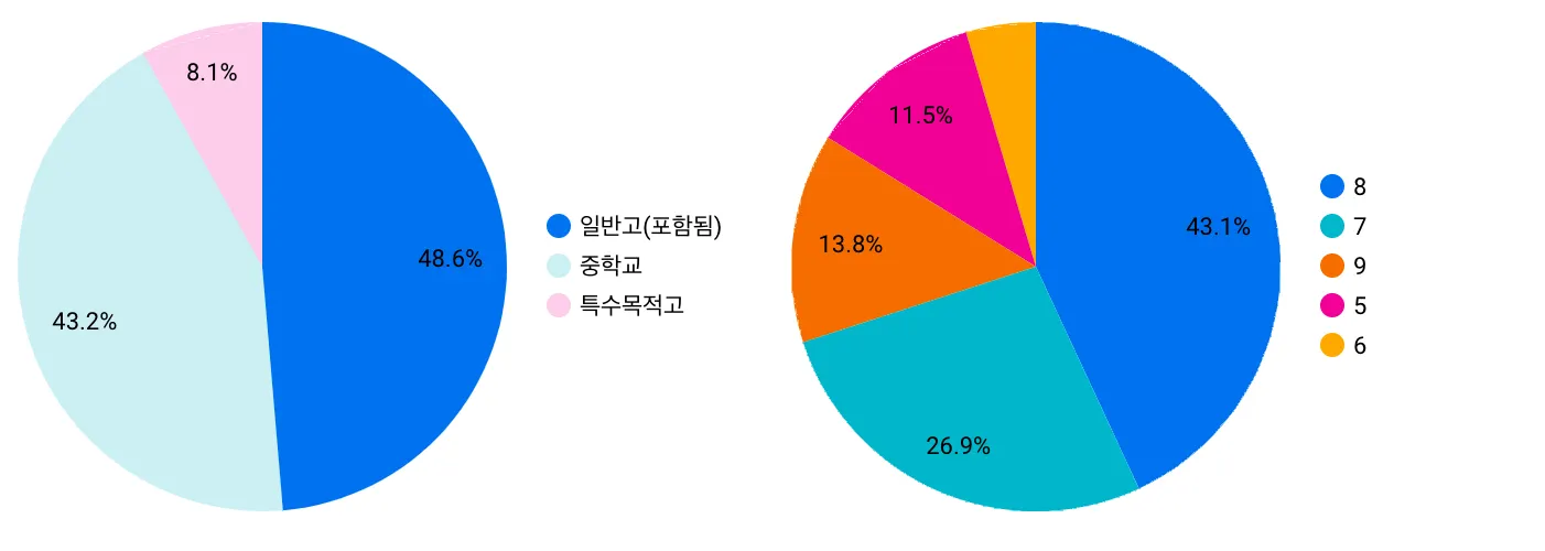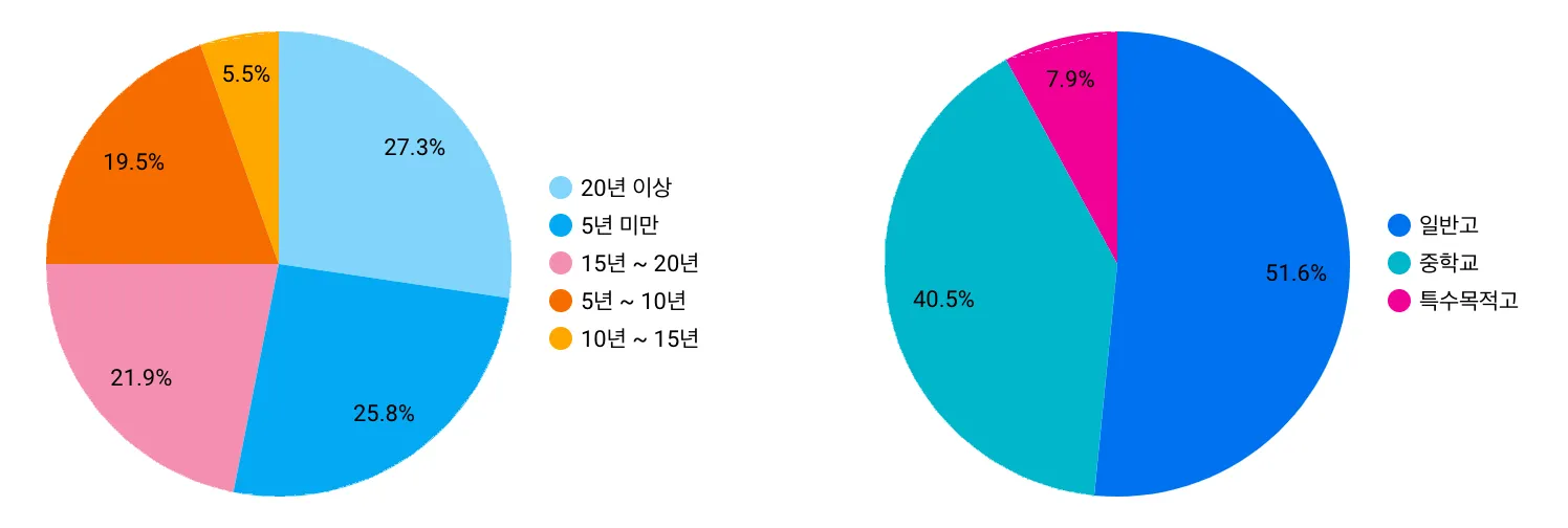 참여해 주신 선생님들의 경력에서는 10년에서 15년 사이를 제외하면 고른 분포를 보이고 있네요! 근무하고 계시는 환경에서는 일반 고등학교에 다니시는 선생님의 비중이 가장 높았습니다.