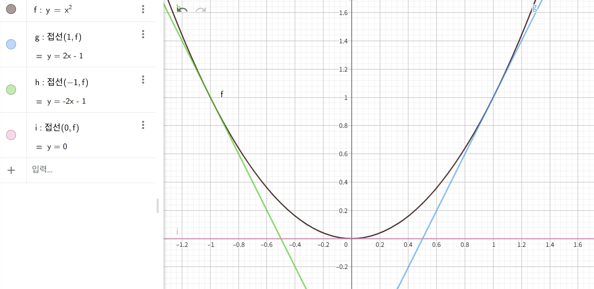 지오지브라에서 의 그래프의 접선의 기울기 그래프를 그려 봅시다.
