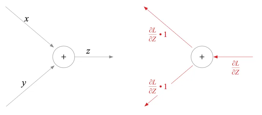 [그림] 덧셈일 때 역전파되어 흘러가는 값