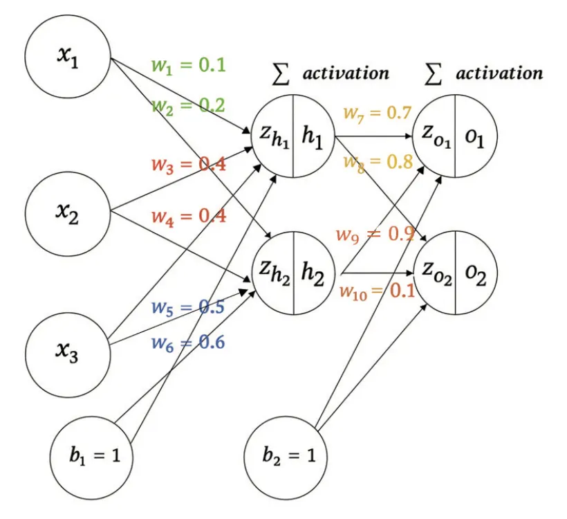 손실함수의 값을 줄이기 위해 가중치를 갱신하는 과정을 간략하게 정리하면, 먼저 가중치의 초깃값들로 순방향 전파(forward pass)를 합니다.