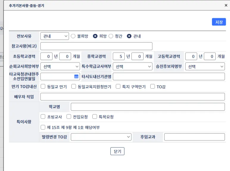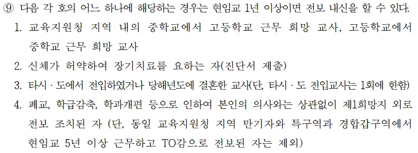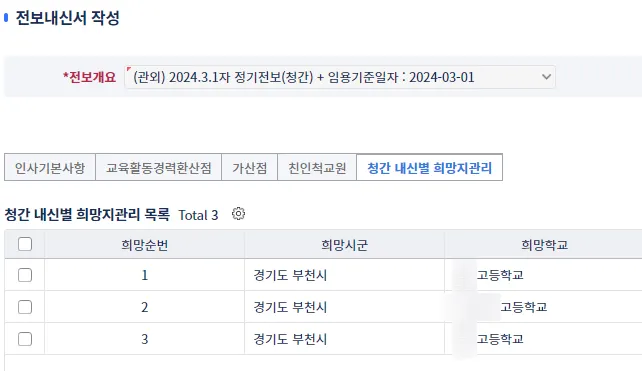 현임교 재직년수 기준 4년 이하일 때는, 관내 가고 싶은 학교를 한 곳만 쓸 수 있고,