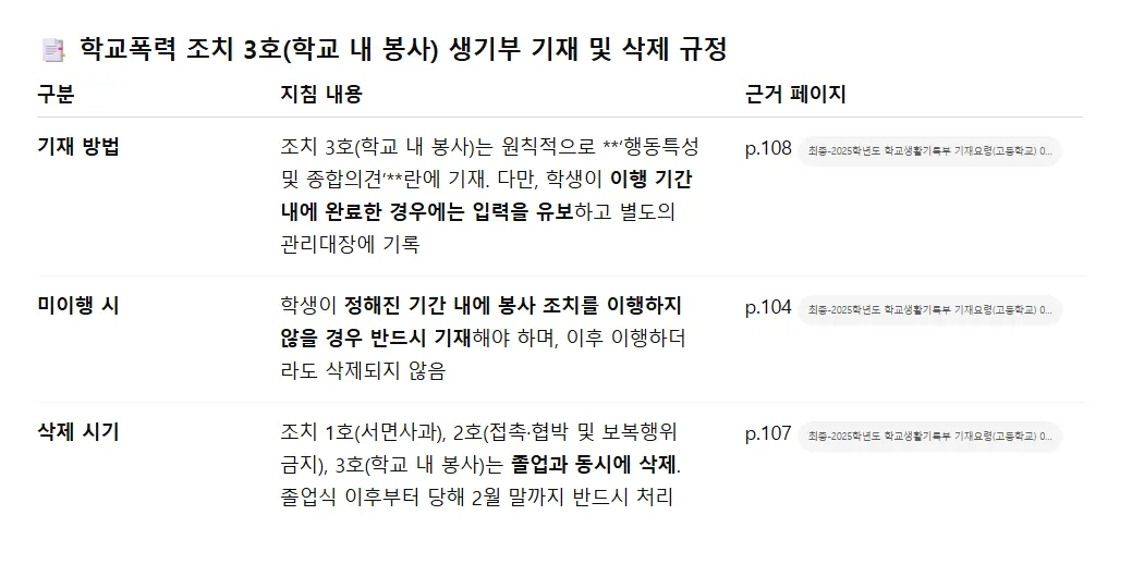 [한 학생이 학교폭력 사안으로 조치 3호(학교 내 봉사)를 받은 경우,