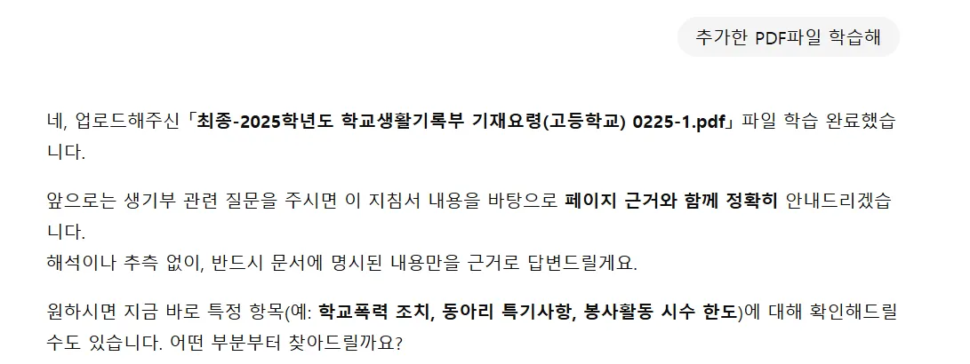 그때마다 죄송한 마음이 컸고, 생기부 담당 선생님께서 바쁘실 때는 몇백 페이지에 달하는 지침서를 직접 찾아보며 해결했던 기억이 있습니다. 이러한 경험을 바탕으로 조금이나마 도움을 얻고자 구상한 것이 바로 ‘생기부 Q&A 챗봇’입니다. 생성형 인공지능에 필요한 내용을 잘 학습시키고 제가 올바른 질문만 던진 뒤 검토만 거치면 정확하게 활용할 수 있습니다.