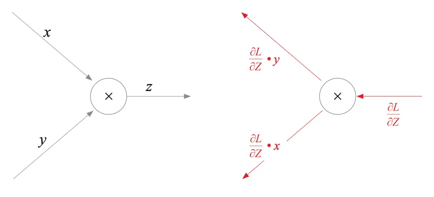 z=xyz=xy 일 때 곱셈 노드에서 흘러가는 값은 상대 값을 곱해 주면 됩니다.