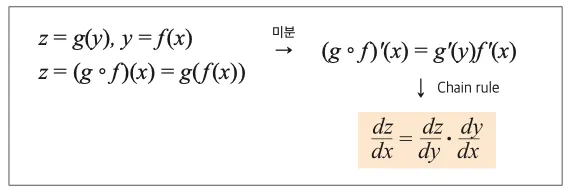 연쇄법칙(chain rule)은 합성 함수의 미분법으로, 여러 함수가 사슬처럼 연결되어 있을 때 각 함수의 미분 결과를 곱하여 최종 미분 값을 구하는 원리입니다