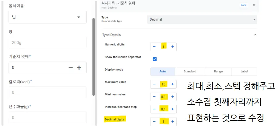 "기준치 몇 배"에 1.5인분 같은 소수점을 입력할 수 있도록 설정해요!