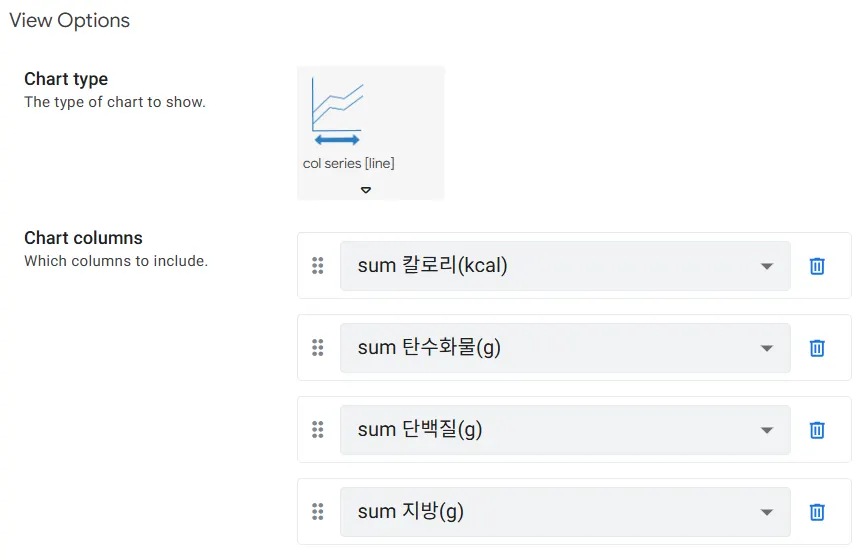 Chat columns에 칼로리, 탄수화물, 단백질, 지방 추가