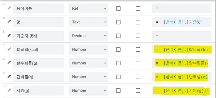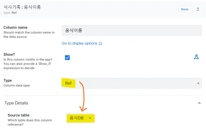 식사기록 테이블의 '음식이름' 컬럼 타입을 'Ref'로 변경