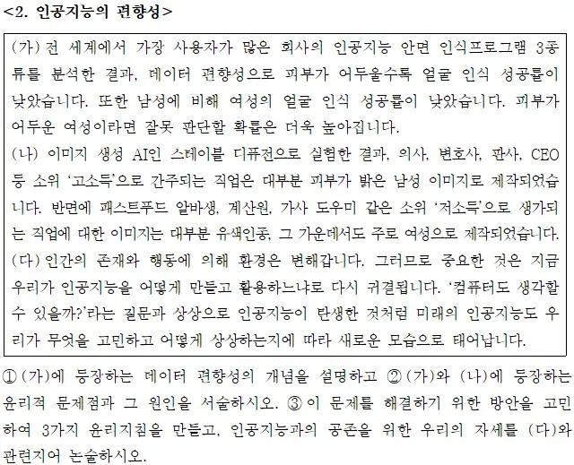 [논술 평가 문항 중 일부, (제시문 출처 : 허유선, 인공지능 윤리를 부탁해, 나무야)]