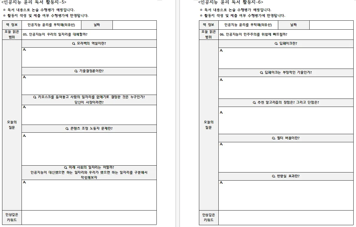 인공지능 윤리와 관련한 독서 활동과 논술 평가까지 소요된 시간은 총 6시간입니다. 독서에 할애한 시간이 4시간, 마무리 및 부가 독서 활동 1시간, 그리고 논술 평가 1시간입니다. 학생들에게 제공한 강제 독서 ㅎㅎ 시간이 의미 있었고, 활동지를 통해 아이들의 생각과 관심을 사전에 확인할 수 있었습니다. 또한, 미리 독서를 통해 고민한 후 논술 평가를 하니 확실히 아이들의 생각이 조금 정리되어 작성된 것을 느낄 수 있었습니다.
