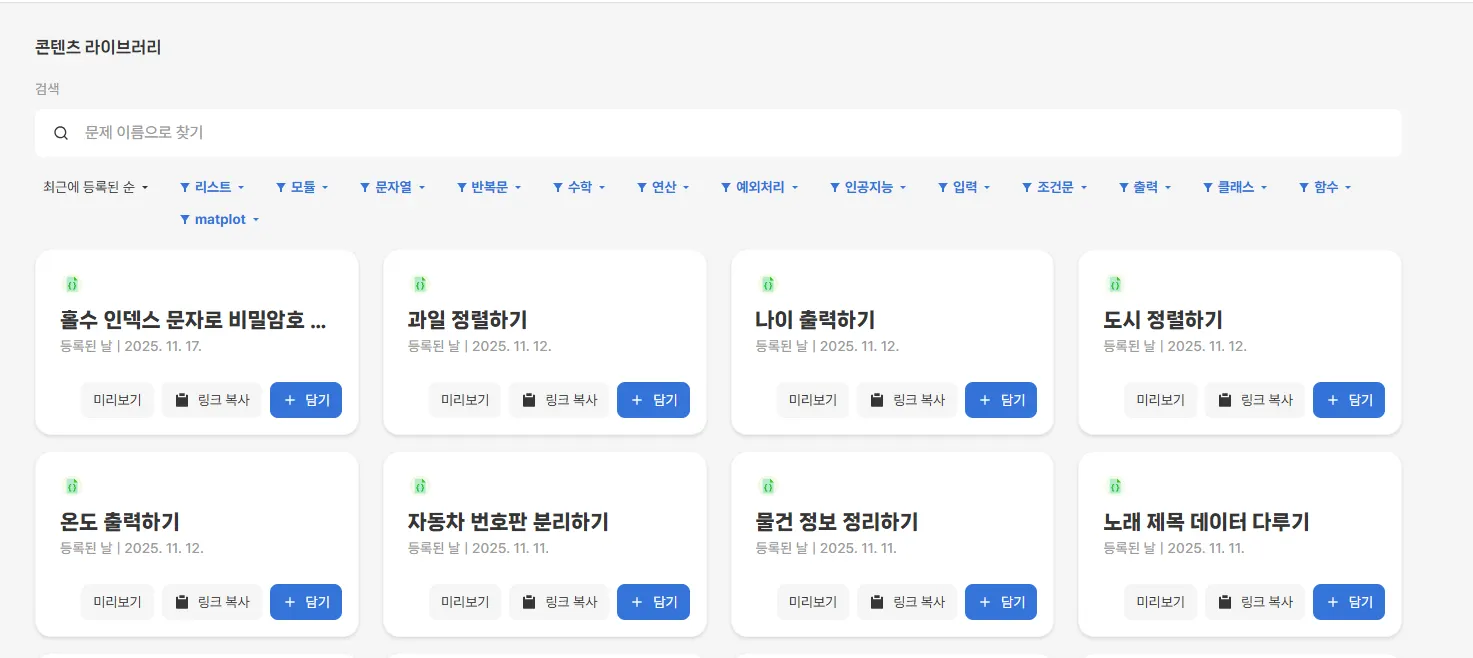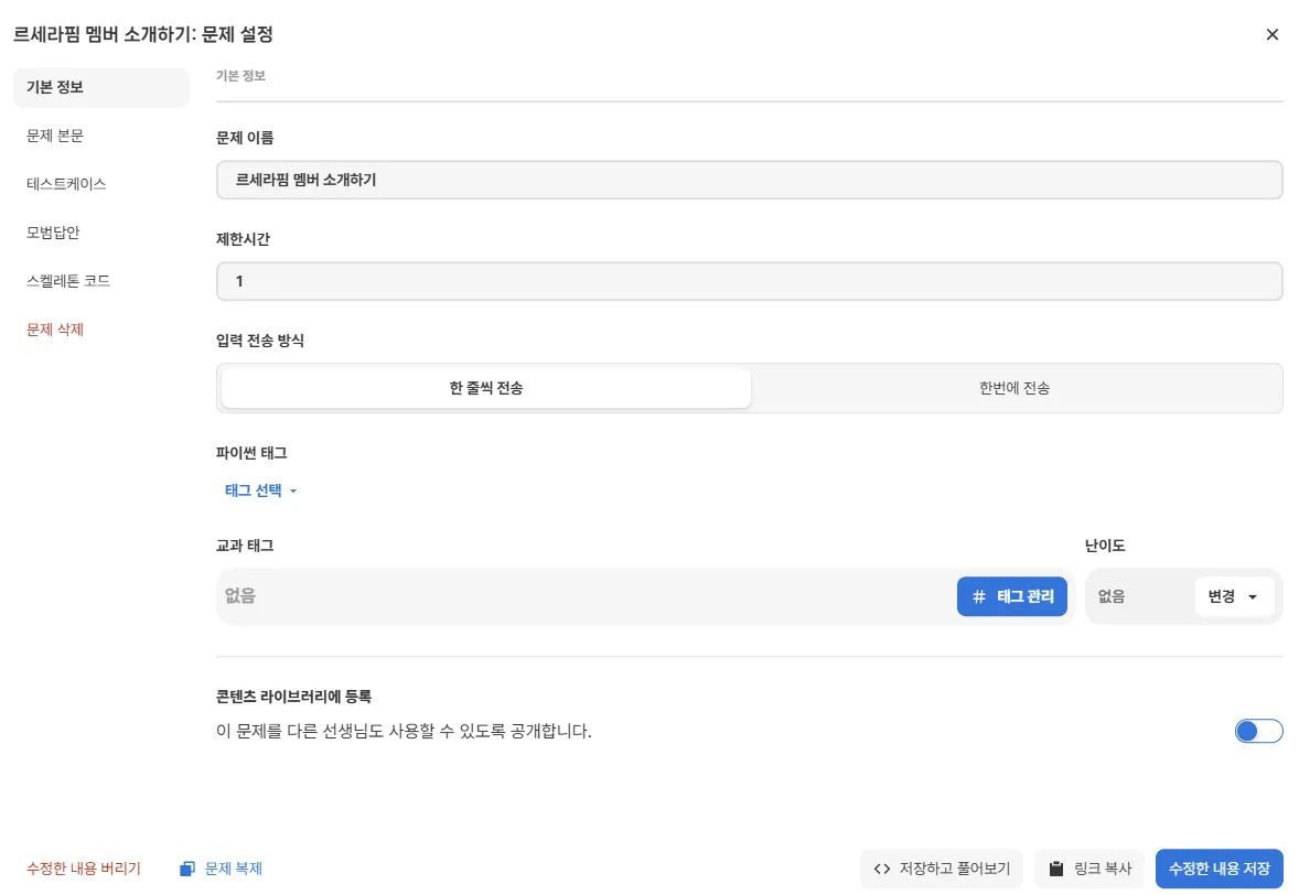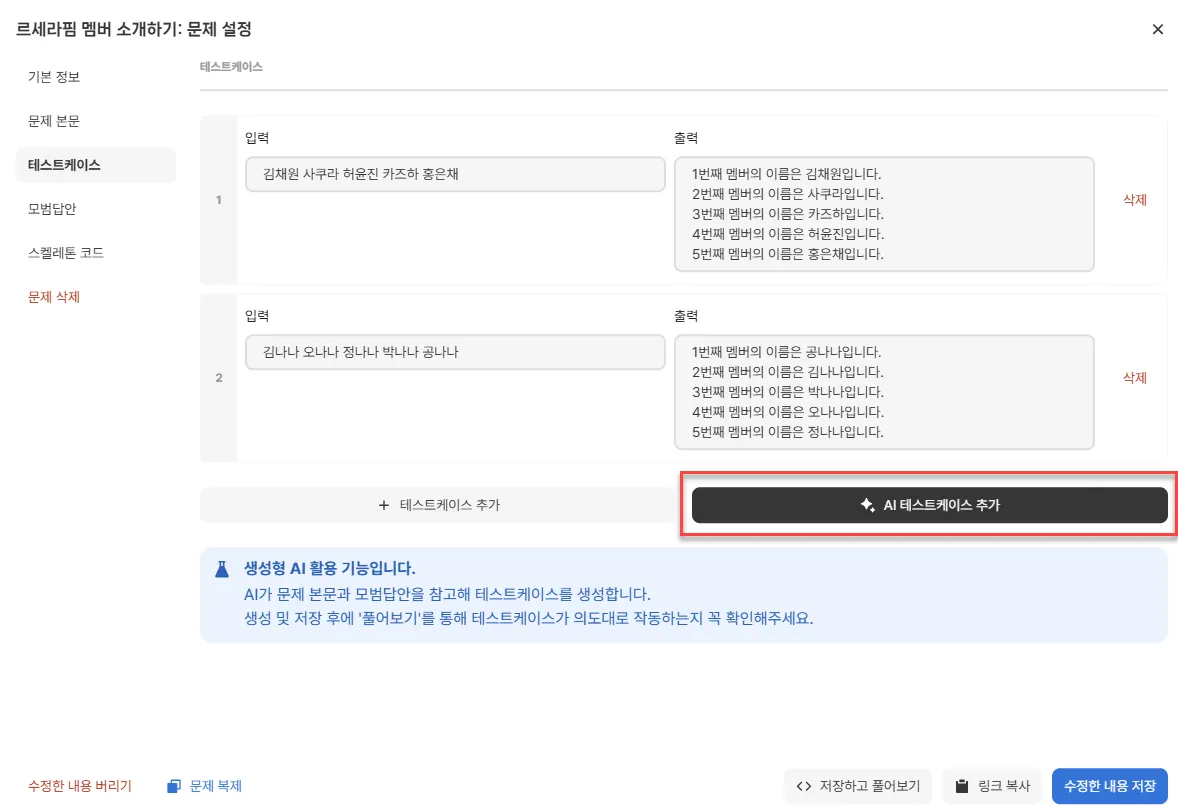 문제 기본정보, 본문, 테스트 케이스와 모범 답안을 만들면 되고, 기존 문제 은행에서 가져와 수정하여 사용할 수 있습니다. 특히, 테스트 케이스를 만들 때 AI 기능이 있어 손쉽게 여러 케이스를 만들 수 있어요.