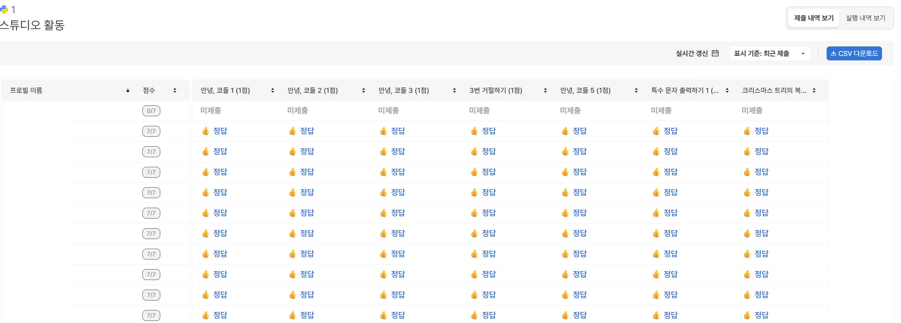 코들의 좋은 점 중의 또 하나는 진도 체크가 가능하다는 점이에요. 문제의 해결 속도를 실시간으로 확인하여 어려움을 겪는 친구들을 미리 파악할 수 있습니다. 또한, 계속적인 오류 발생 학생의 최근 코드도 확인할 수 있어 적절한 피드백을 주기에도 용이합니다.