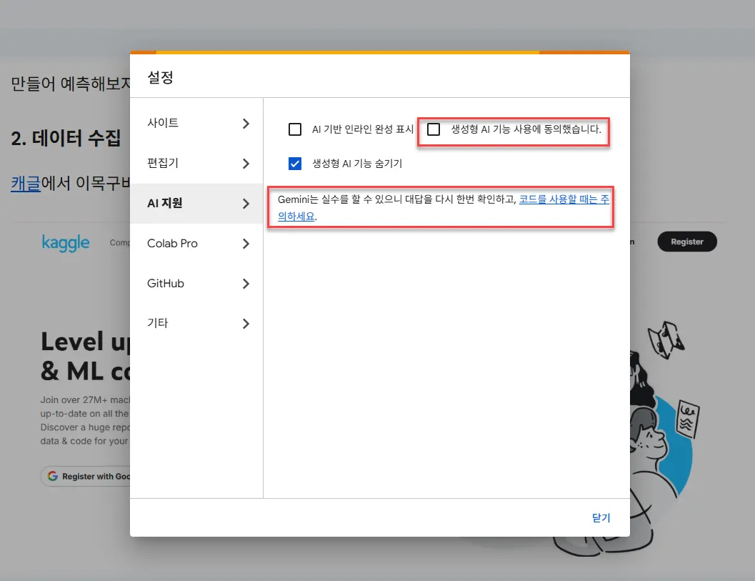 또 하나의 장점이자 단점을 말씀드릴게요. 구글 기반의 코랩에서는 생성형 AI인 Gemini를 연동하여 사용할 수 있습니다. 코드 수정과 개선에 있어 AI의 도움을 받을 수 있는 환경이 됩니다. 학생의 개별 프로젝트 진행 시에는 도움이 되지만 수업이나 수행평가 환경에서는 반드시 기능 숨기기를 확인하고 진행하는 것이 좋습니다.