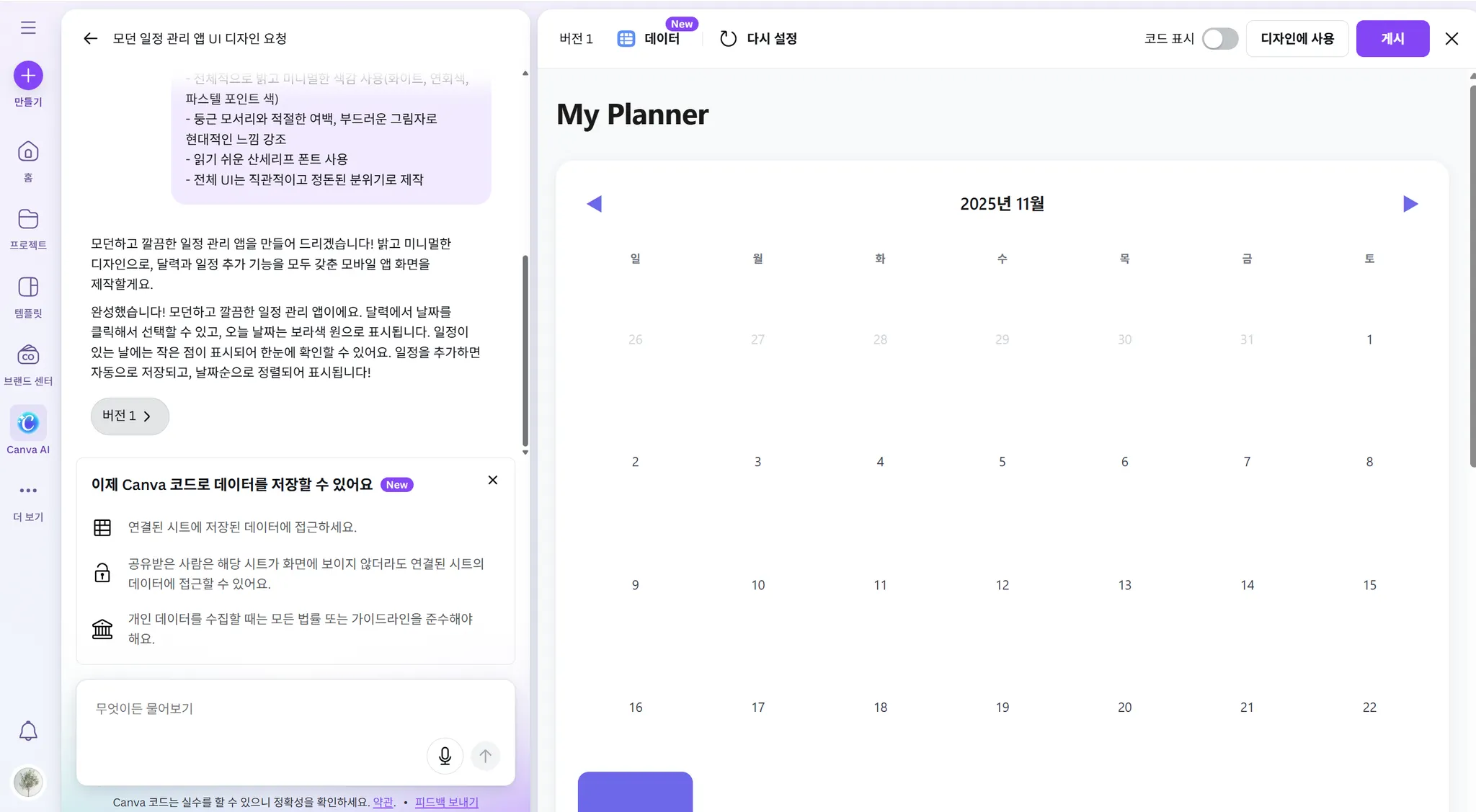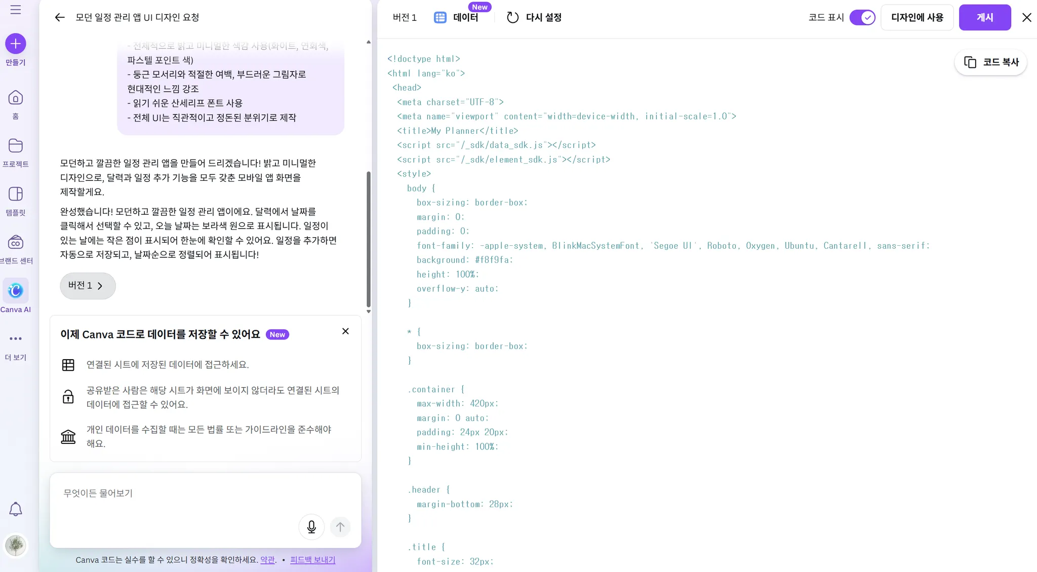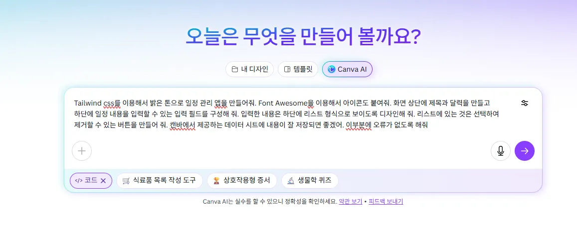 캔바의 인공지능 기능을 이용하여 말하듯이 명령을 내리면 프로그램 코드를 작성해 줍니다.