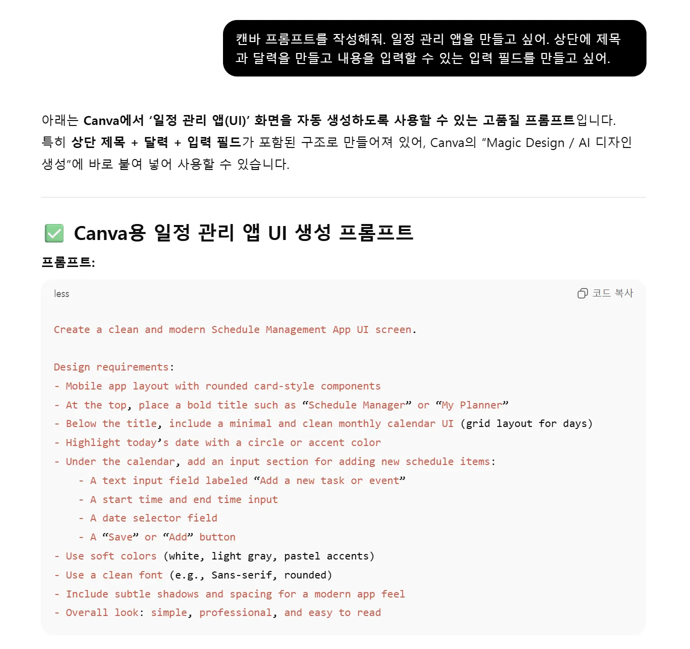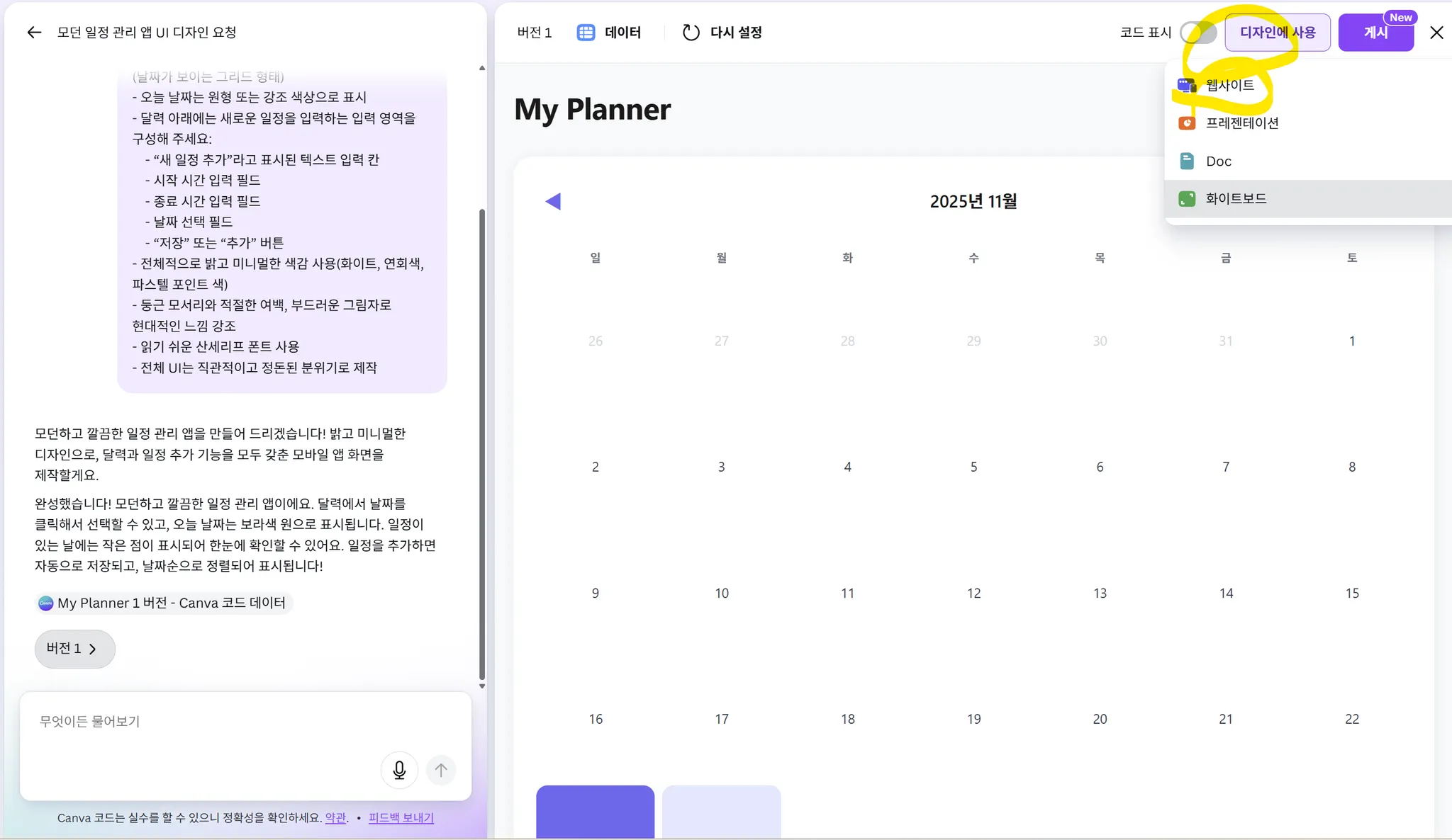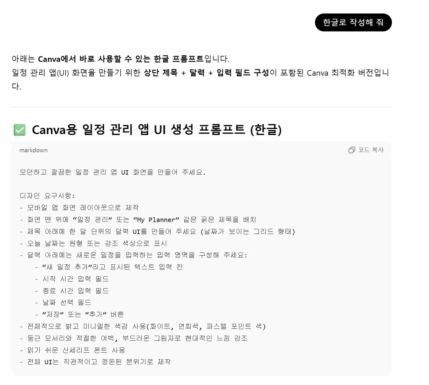 캔바의 인공지능 기능을 이용하여 말하듯이 명령을 내리면 프로그램 코드를 작성해 줍니다.