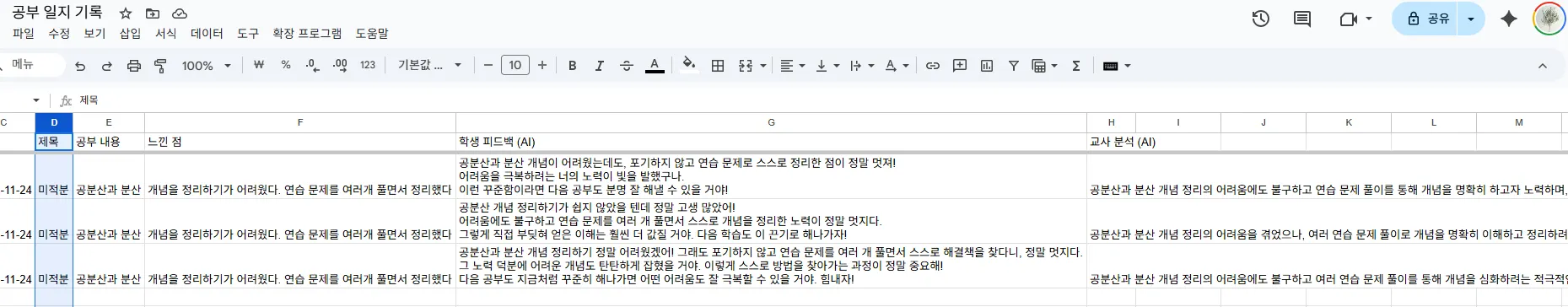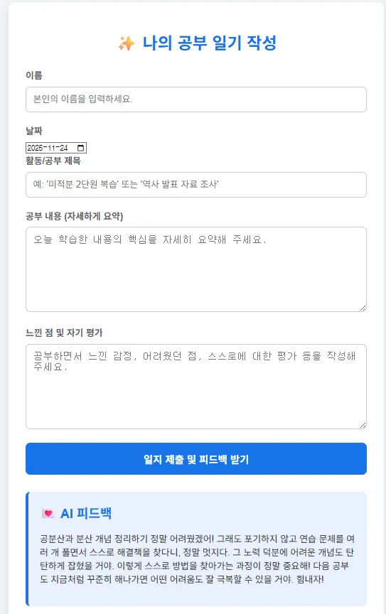 공부 일기를 작성하여 입력하면 학생에게 피드백을 주고, 교사에게는 학생 분석 내용을 알려주는 프로그램을 만들어 보도록 하겠습니다.