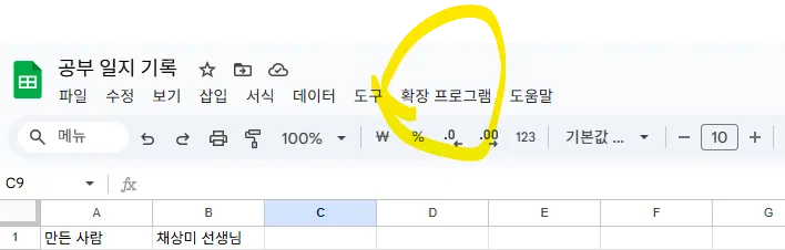 이 키를 시트 B2에 넣은 후 시트에서 구글 앱스 스크립트 프로그램을 열도록 합니다.