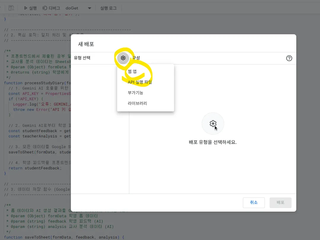 재미나이 API 키를 구글 앱스 스크립트 설정에 넣도록 하겠습니다.