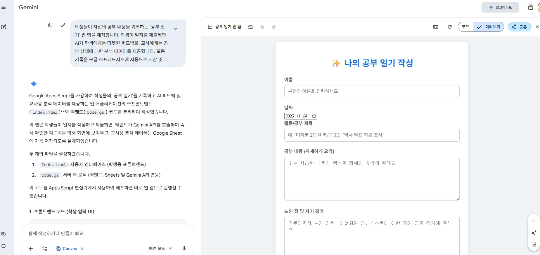 스크립트 생성은 재미나이에서 만든 후 Apps Script 에 코드를 복사하여 사용합니다.