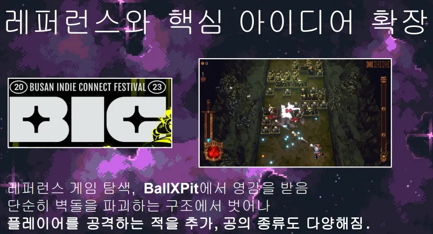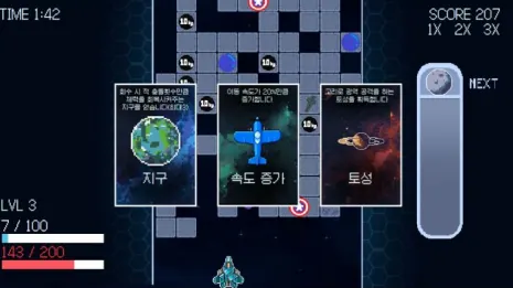 ⇒ 게임 요약 내용: 2D 탑 뷰 아케이드 장르로 흔한 벽돌깨기 게임에 최근 게임 트렌드 시스템 중 하나인 증강 시스템 게임을 추가함.