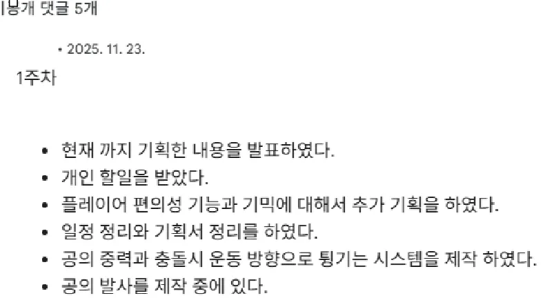 1주차: 사전에 프로젝트 수업에 대해 설명 후 알리고 만들고 싶은 게임(장르, 컨셉, 핵심 시스템, 레퍼런스 게임 등)을 생각해오라고 합니다. 교사는 기한 내 구현이 가능한지, 어떤 부분에 중점을 두어야 하는지, 무엇부터 개발해야 하는지 피드백합니다.