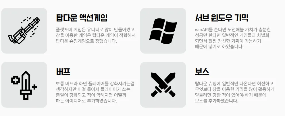 ⇒ 게임 요약 내용: 기본적인 2D 탑다운 슈터 장르로 윈도우 API를 게임에 녹여내기 위해 버프창을 게임 화면 위에 띄워 적을 물리치는 게임