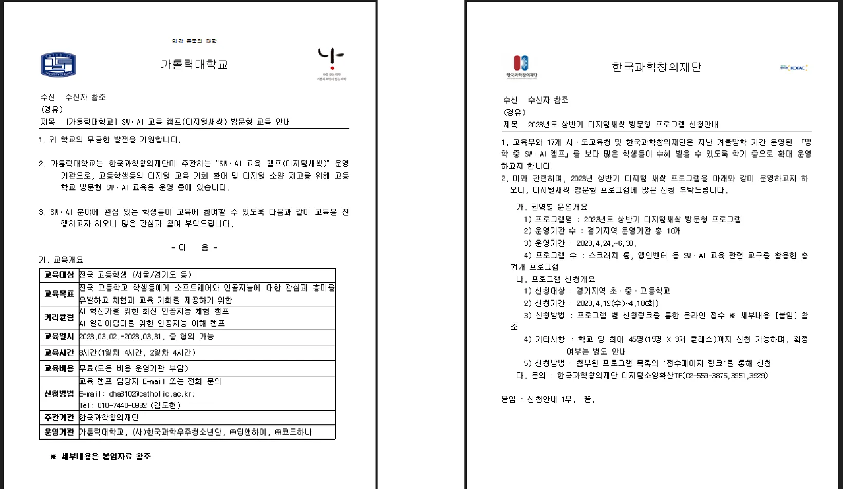 아래는 각각 3월과 4월에 저희 학교로 발송되었던 oo대학교와 한국과학창의재단의 디지털 새싹 프
