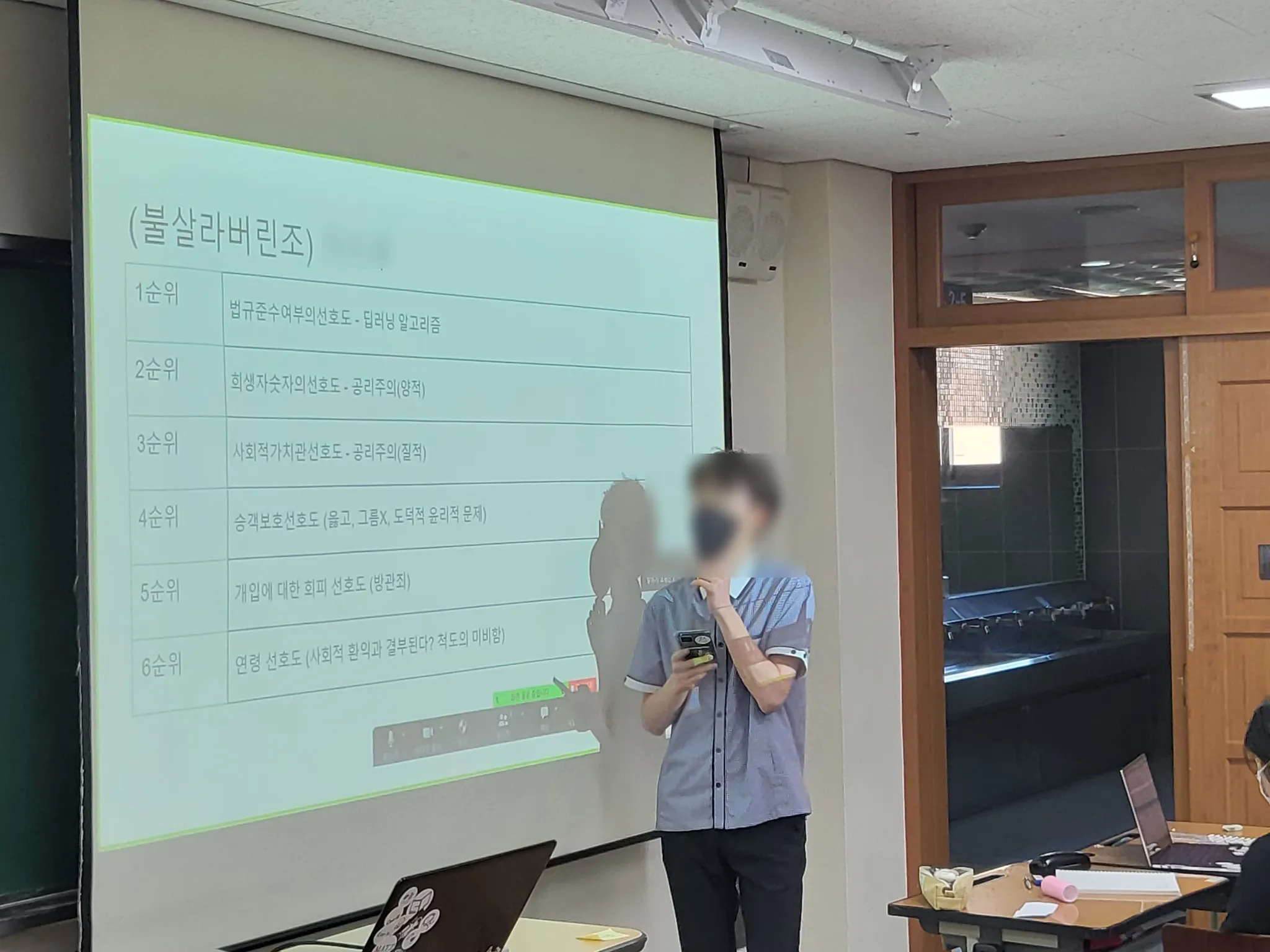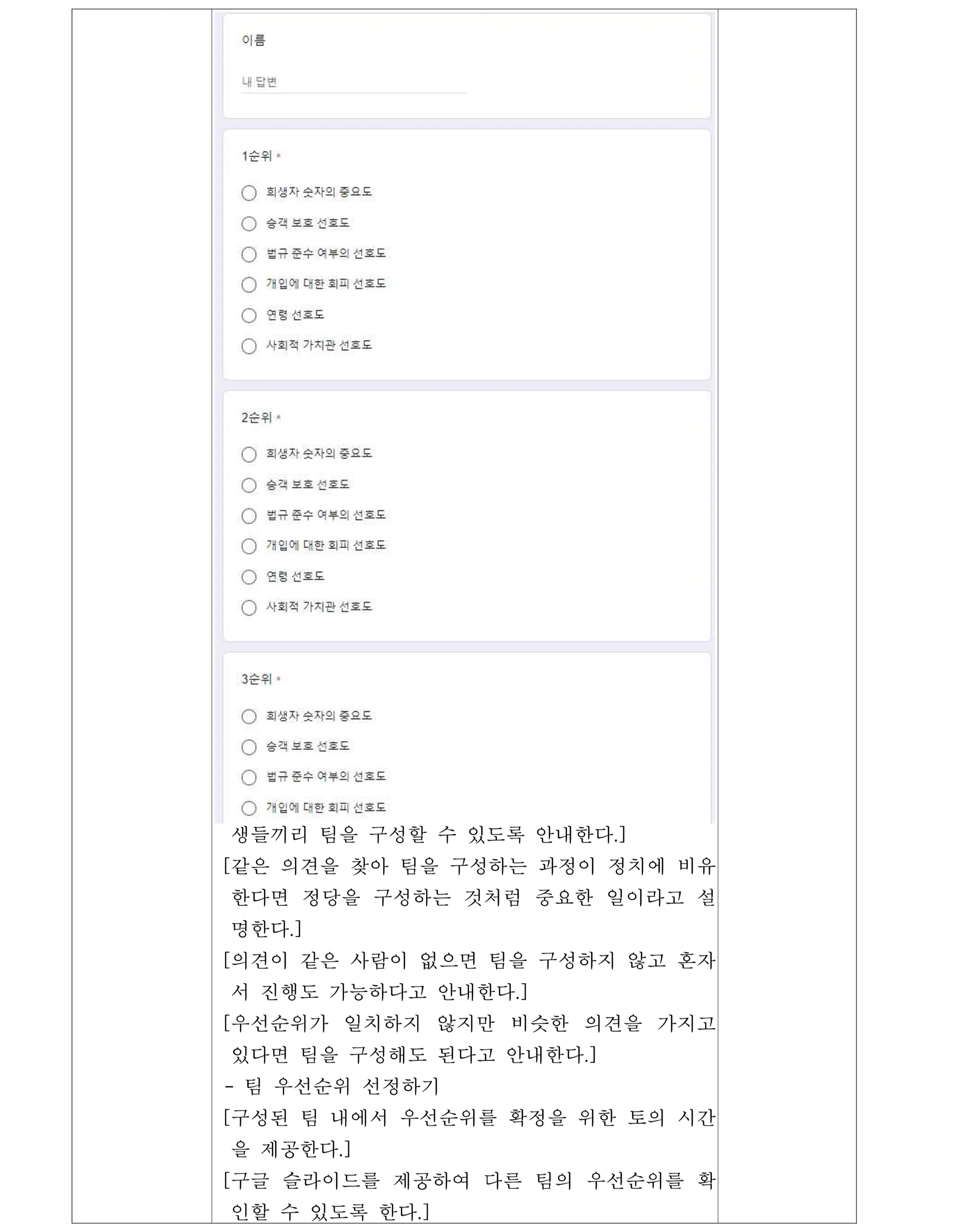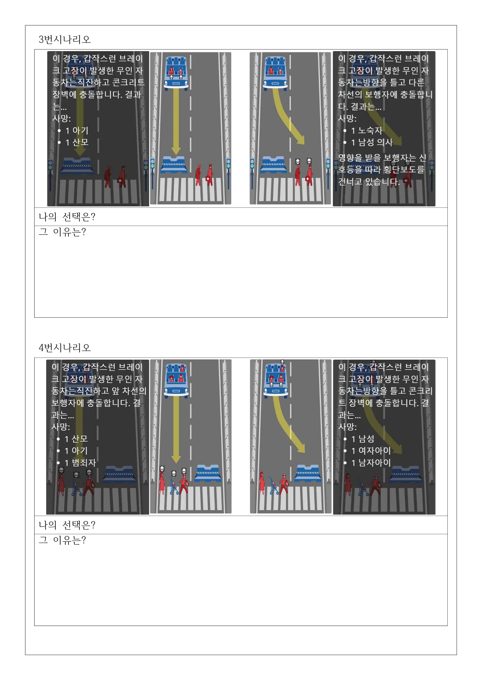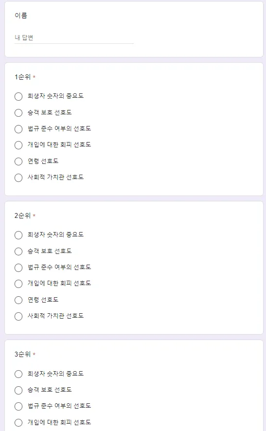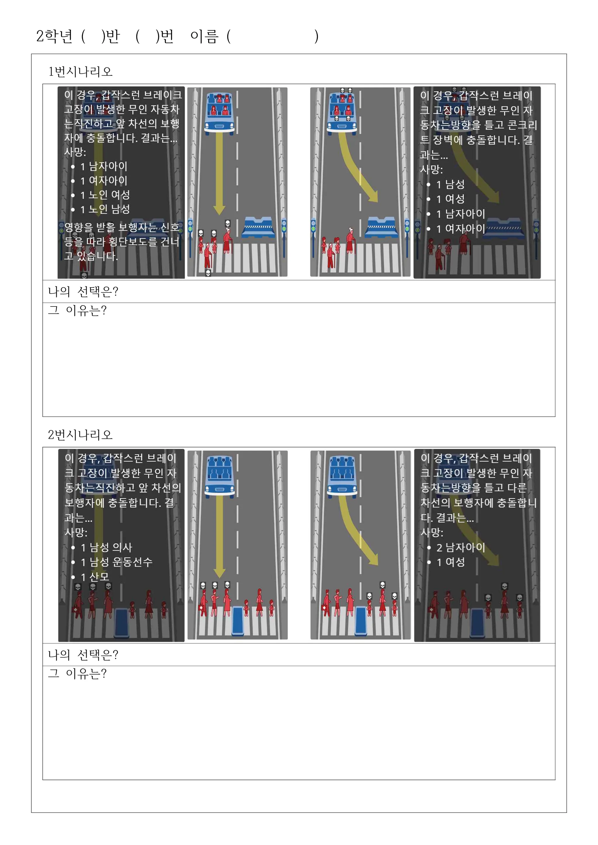 이 중에서 희생자의 숫자의 중요도, 승객 보호 선호도, 법규 준수 여부의 선호도, 개입에 대한 회피 선호도, 연령 선호도, 사회적 가치관 선호도를 제시하고 학생 개인의 우선순위를 선택하도록 구글 설문을 제시했습니다.