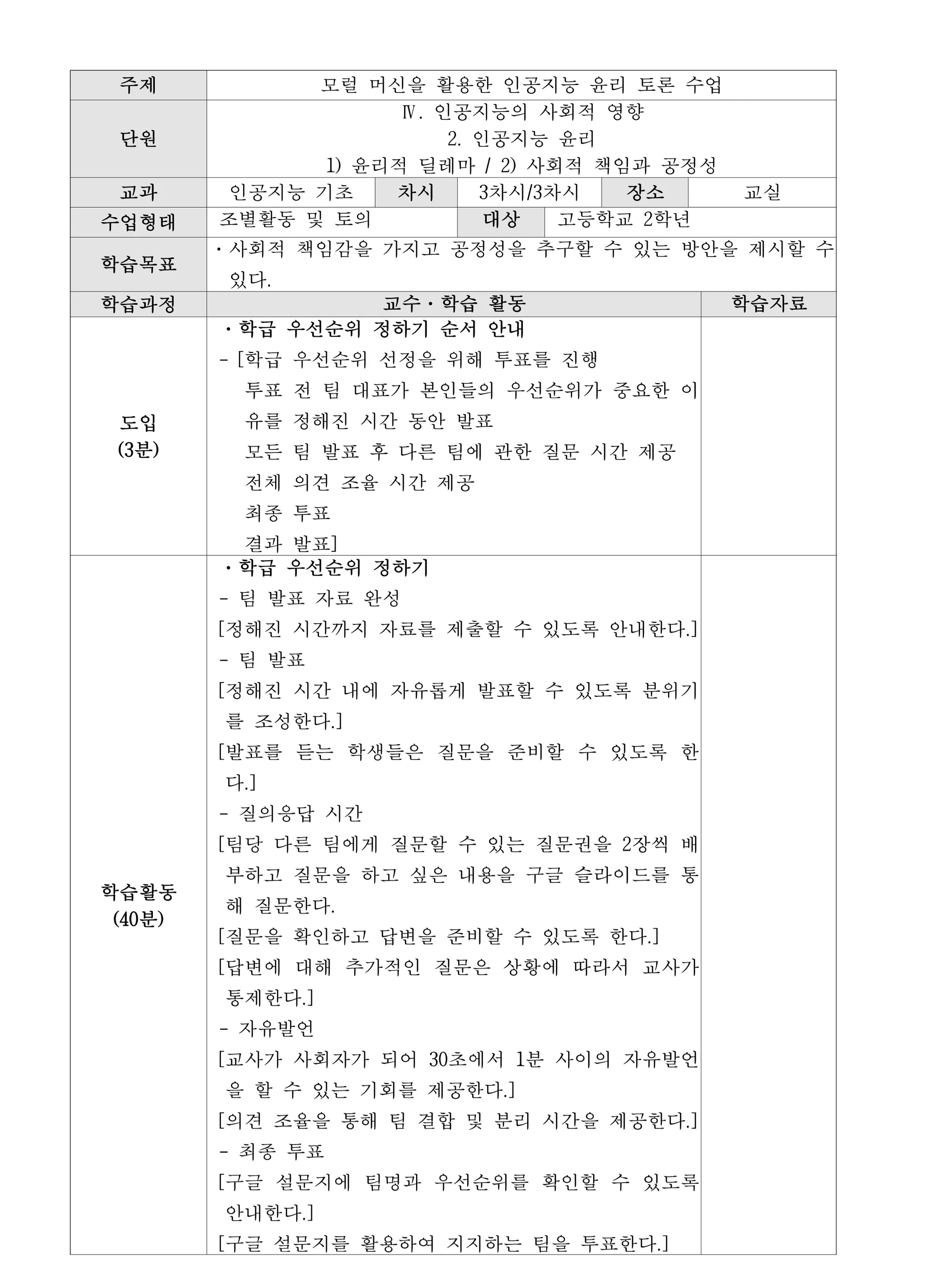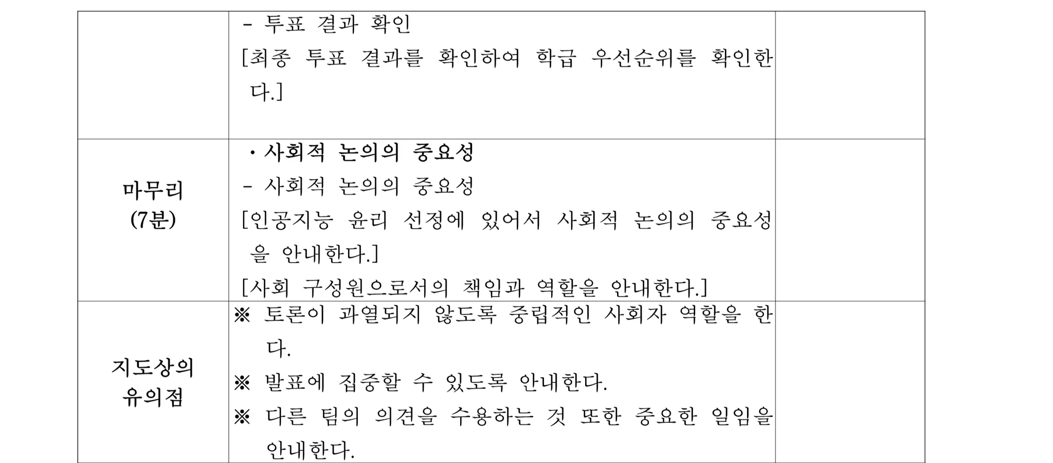 이러한 수업을 통해 학생들은 인공지능 윤리 수업에 활발하고 적극적으로 참여하여 체험하는 활동을 경험할 수 있습니다.
