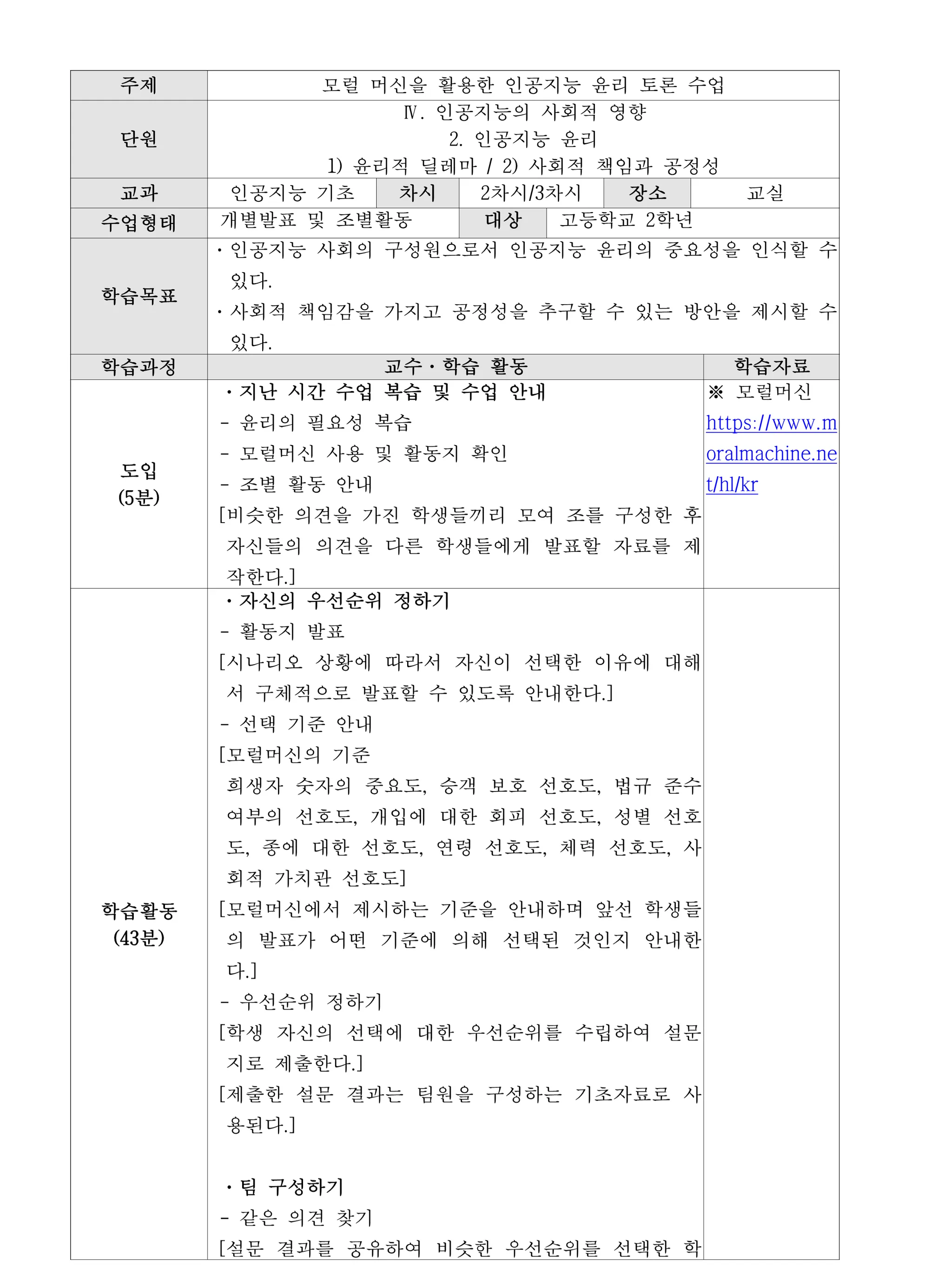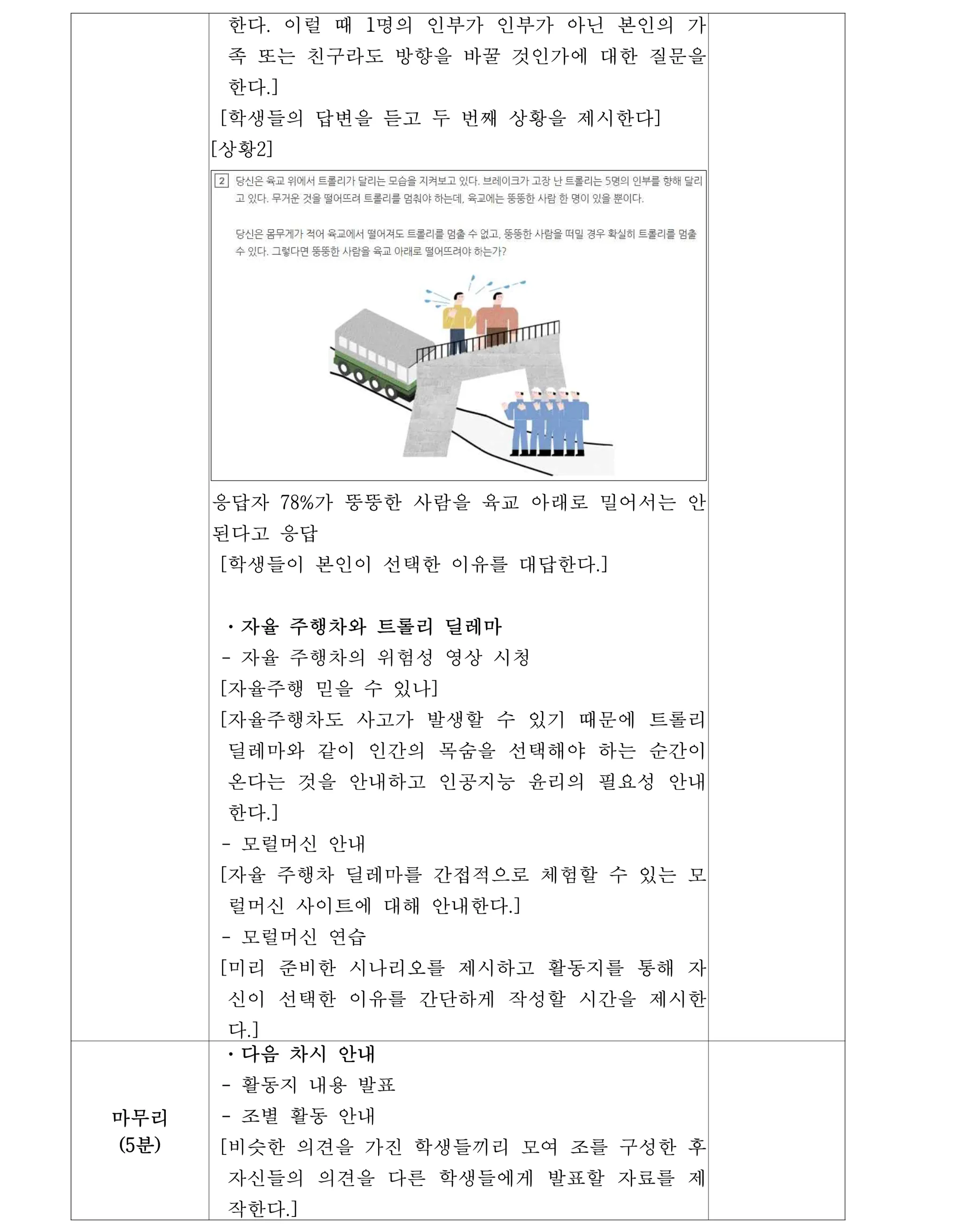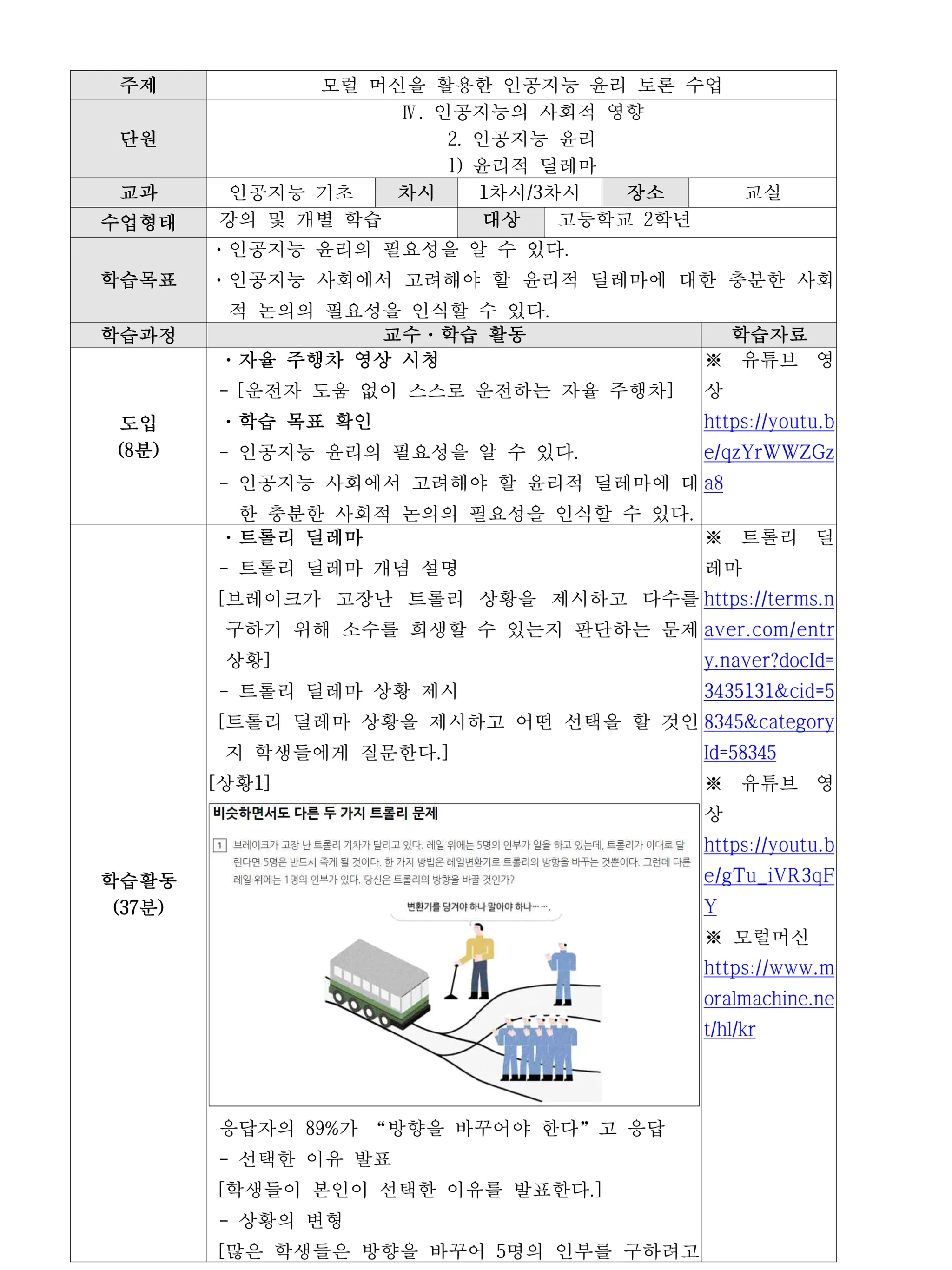저는 해당 부분을 모럴 머신을 활용한 인공지능 윤리 수업으로 진행해 보았습니다.