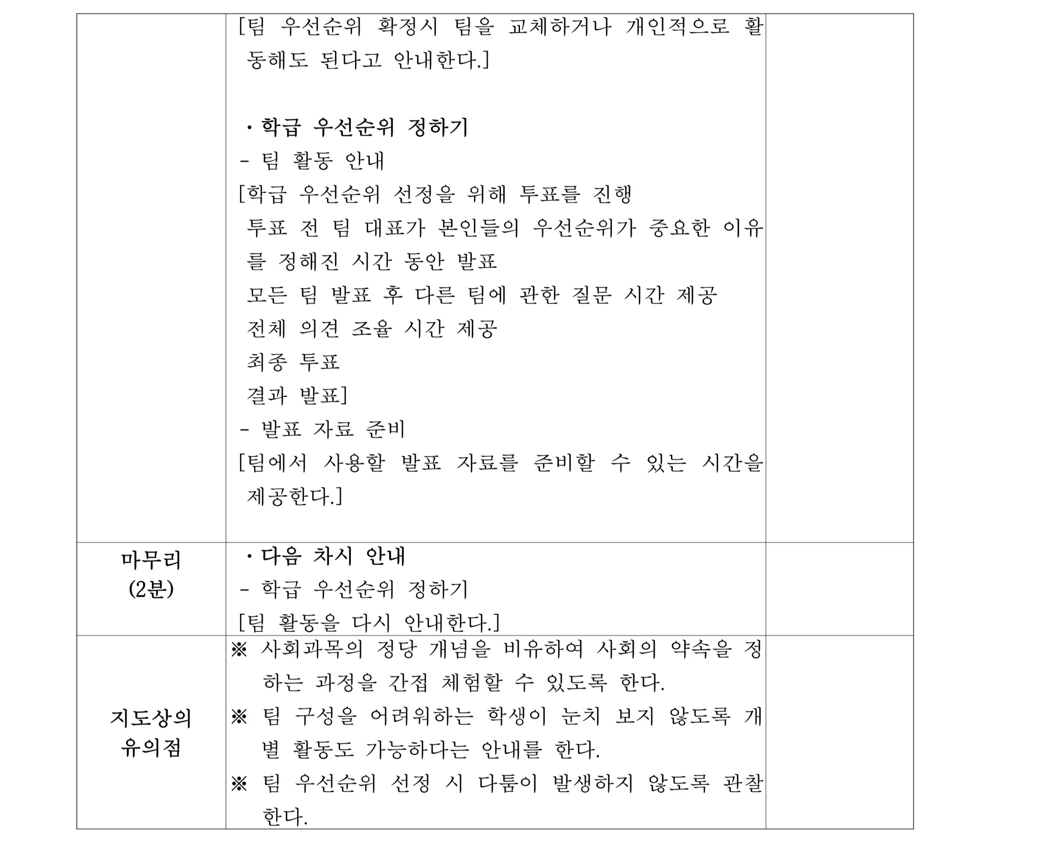 우선순위가 비슷한 학생들끼리 모여 팀을 이루는 것이 정당을 조직하는 과정과 유사하다는 것을 설명하였고, 표를 얻기 위해 발표를 하고 토론하는 과정을 거쳐 다른 사람의 의견을 듣고 자신의 의견을 수정하면서 사회적 합의를 이루는 과정을 경험할 수 있게 노력했습니다.