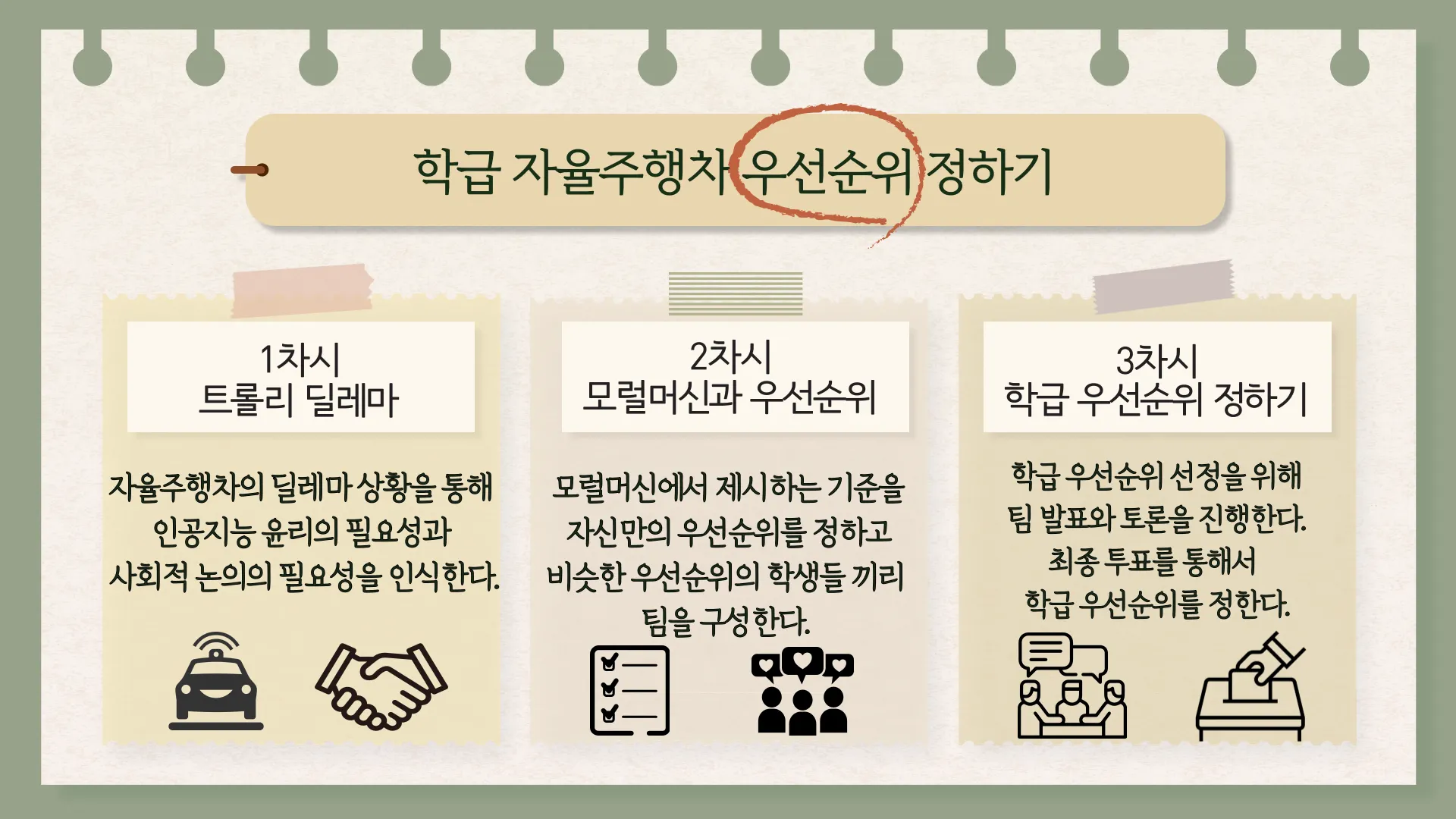 자율주행차가 고장으로 인해 사고가 발생할 경우 어떤 기준을 가지고 선택해야 하는지를 해결하는 과제인데요, 모럴 머신에서 제시한 기준을 바탕으로 학생들이 자율주행차 우선순위를 정하는 수업을 3차시 동안 진행했습니다.