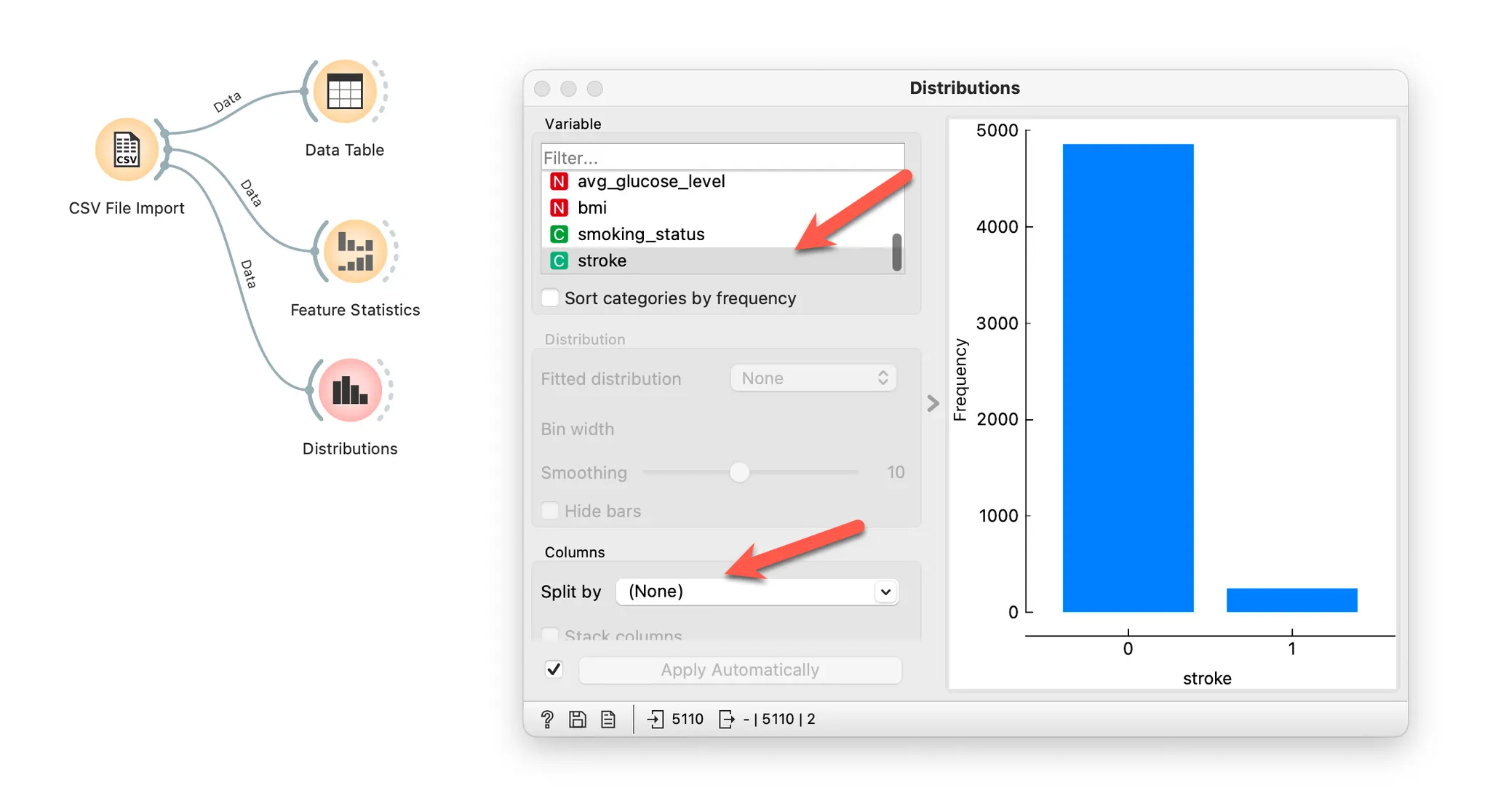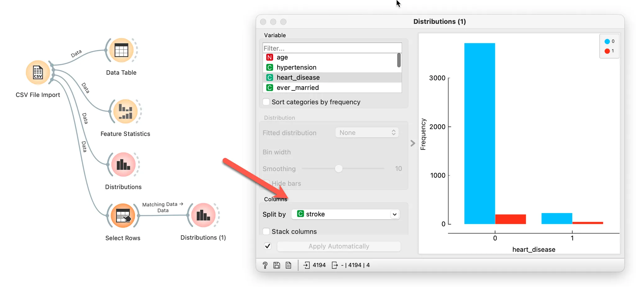타깃인 stroke를 Split by로 설정해 놓은 후에 속성들의 분포를 살펴 봅니다.